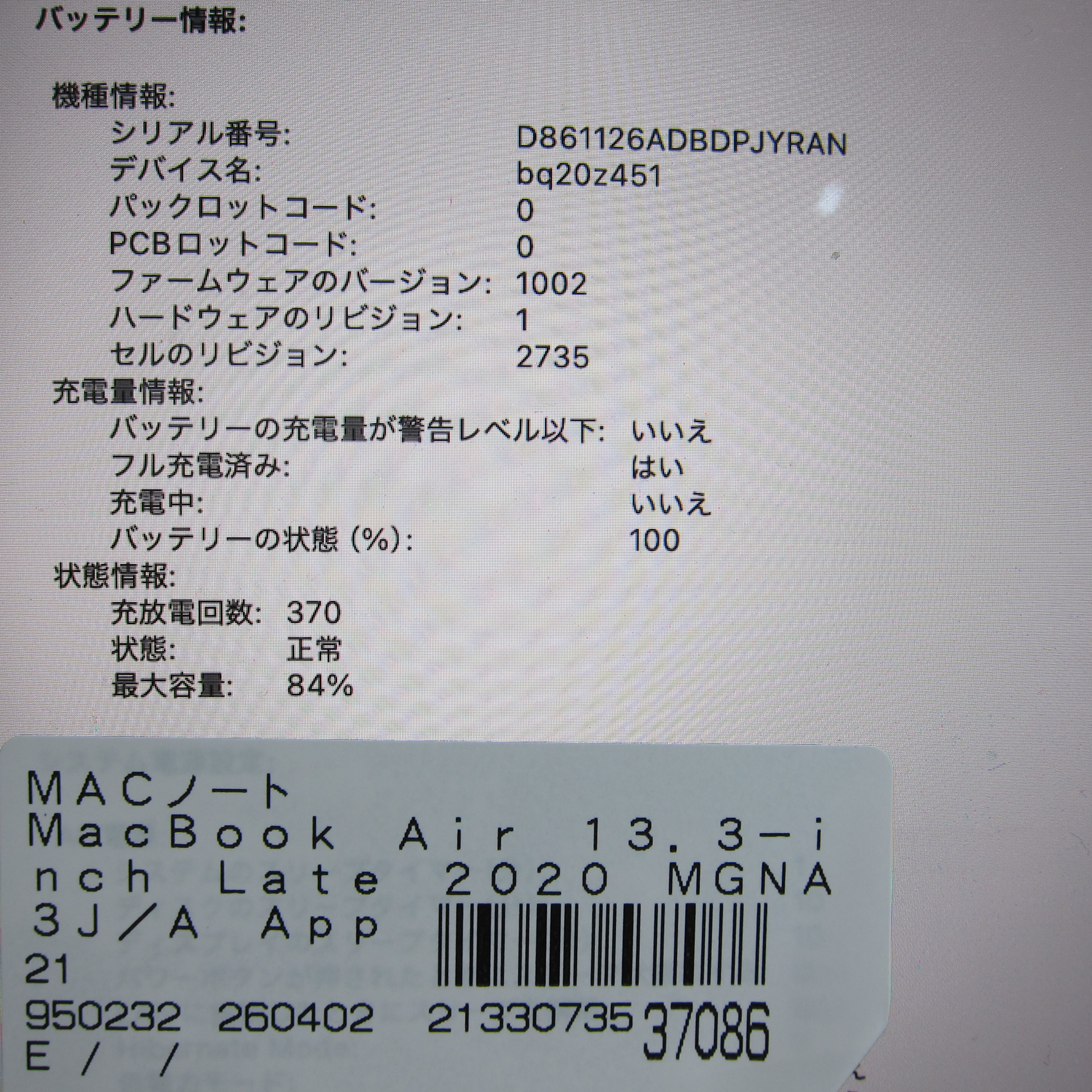 〔中古品〕 MacBook Air 13.3-inch Late-2020 MGNA3J/A Apple M1 8コアCPU_8コアGPU 8GB SSD512GB シルバー 〔26.3 Tahoe〕 [グラフィック:オンボード/JISキーボード]