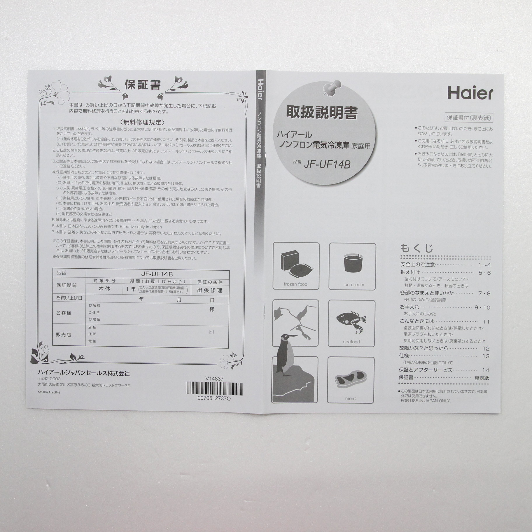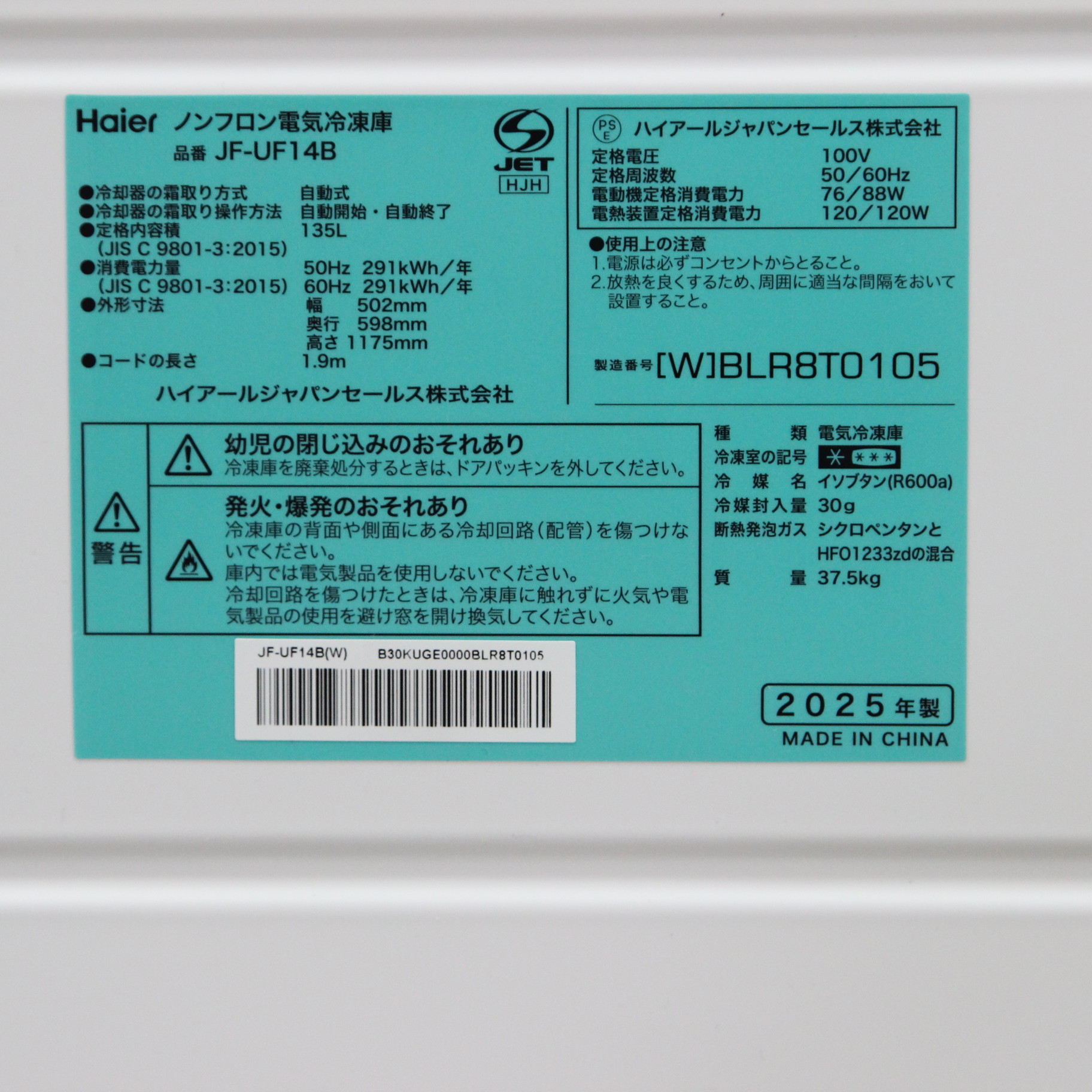 〔展示品〕 冷凍庫 ホワイト JF-UF14B-W [幅50.2cm /135L /1ドア /右開きタイプ]