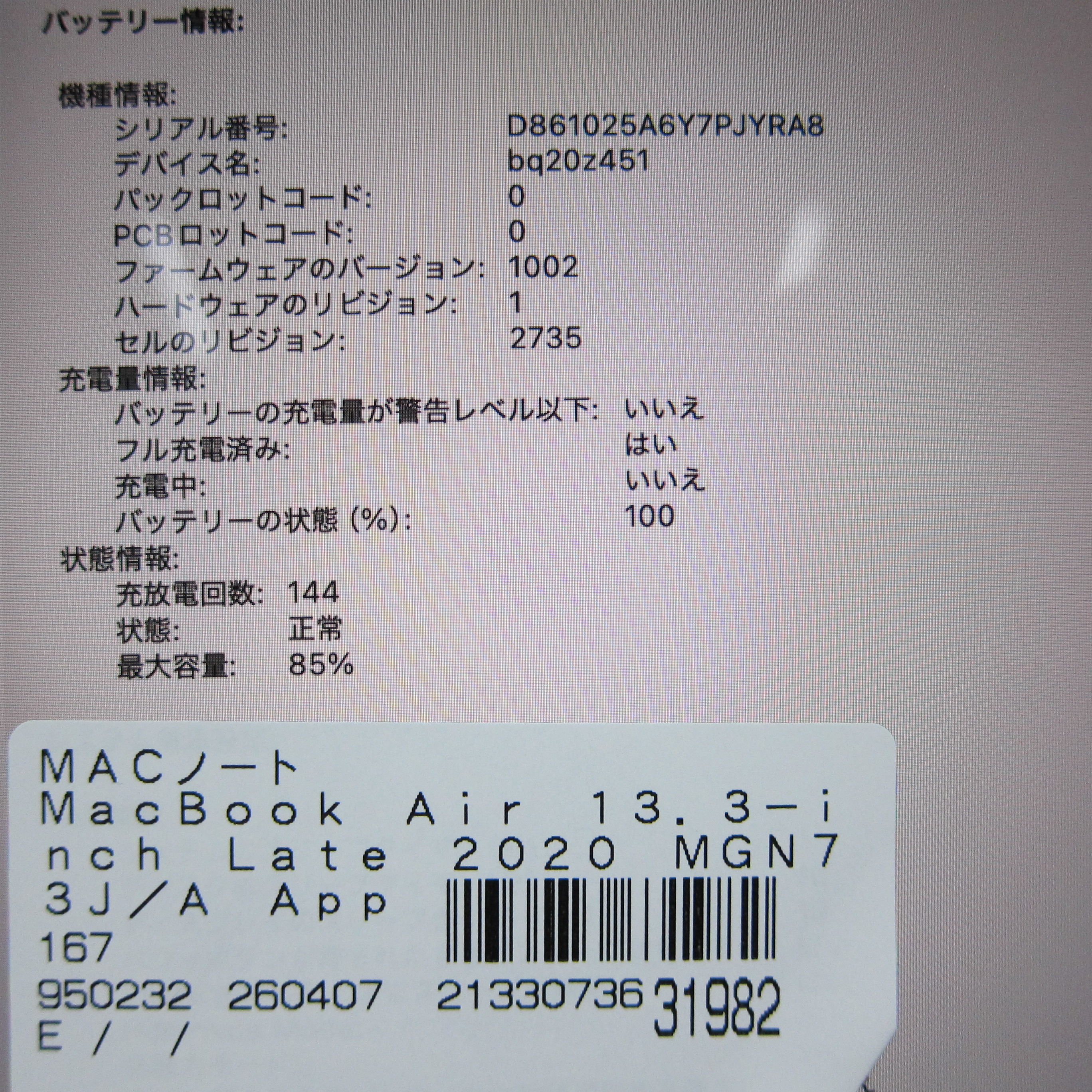 商品名 〔中古品〕 MacBook Air 13.3-inch Late-2020 MGN73J/A Apple M1 8コアCPU_8コアGPU 16GB SSD1TB スペースグレイ 〔26.3 Tahoe〕 [グラフィック:オンボード/JISキーボード]