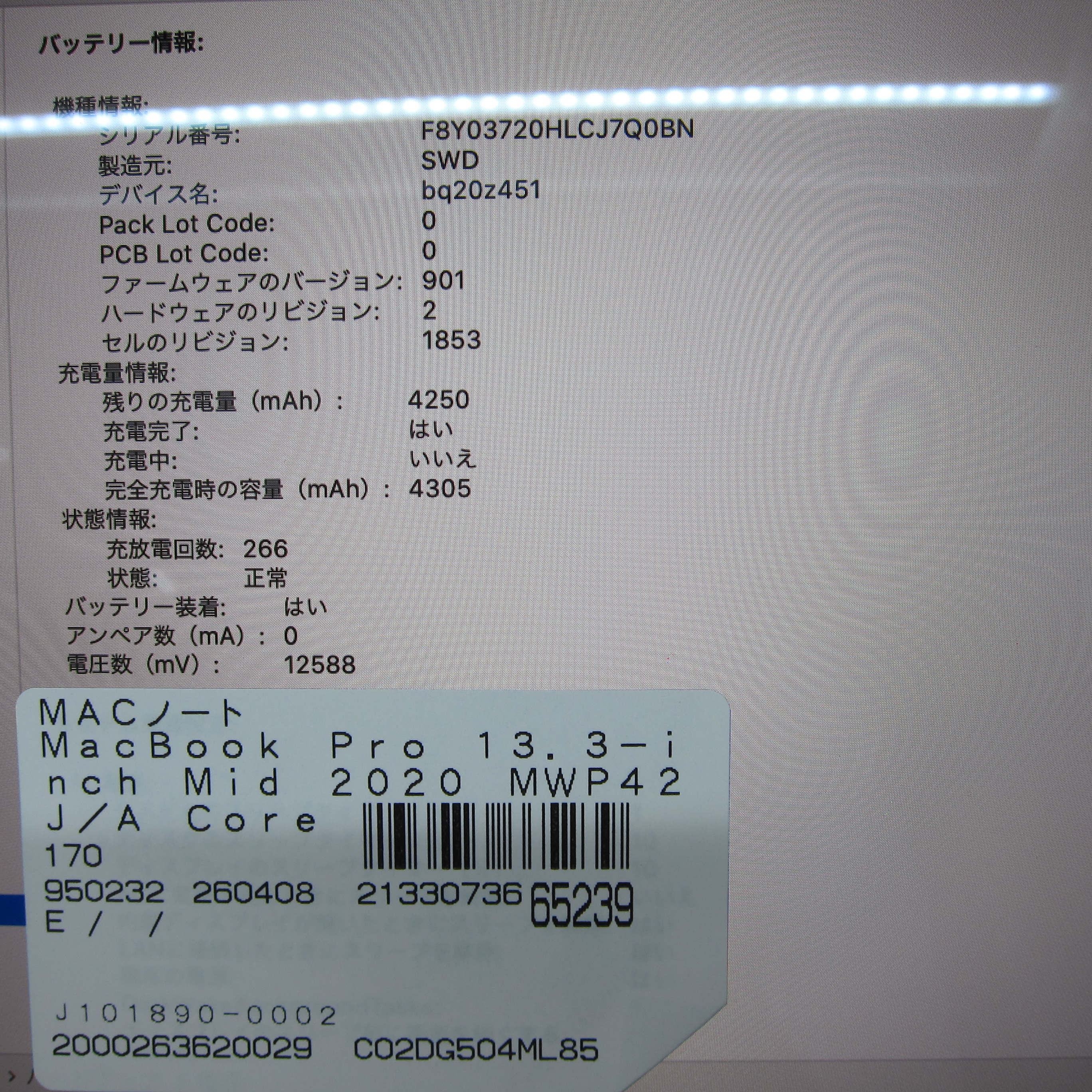 〔中古品〕 MacBook Pro 13.3-inch Mid-2020 MWP42J/A Core_i7 2.3GHz 32GB SSD512GB スペースグレイ 〔10.15 Catalina〕 [グラフィック:Intel Iris Plus Graphics/JISキーボード]