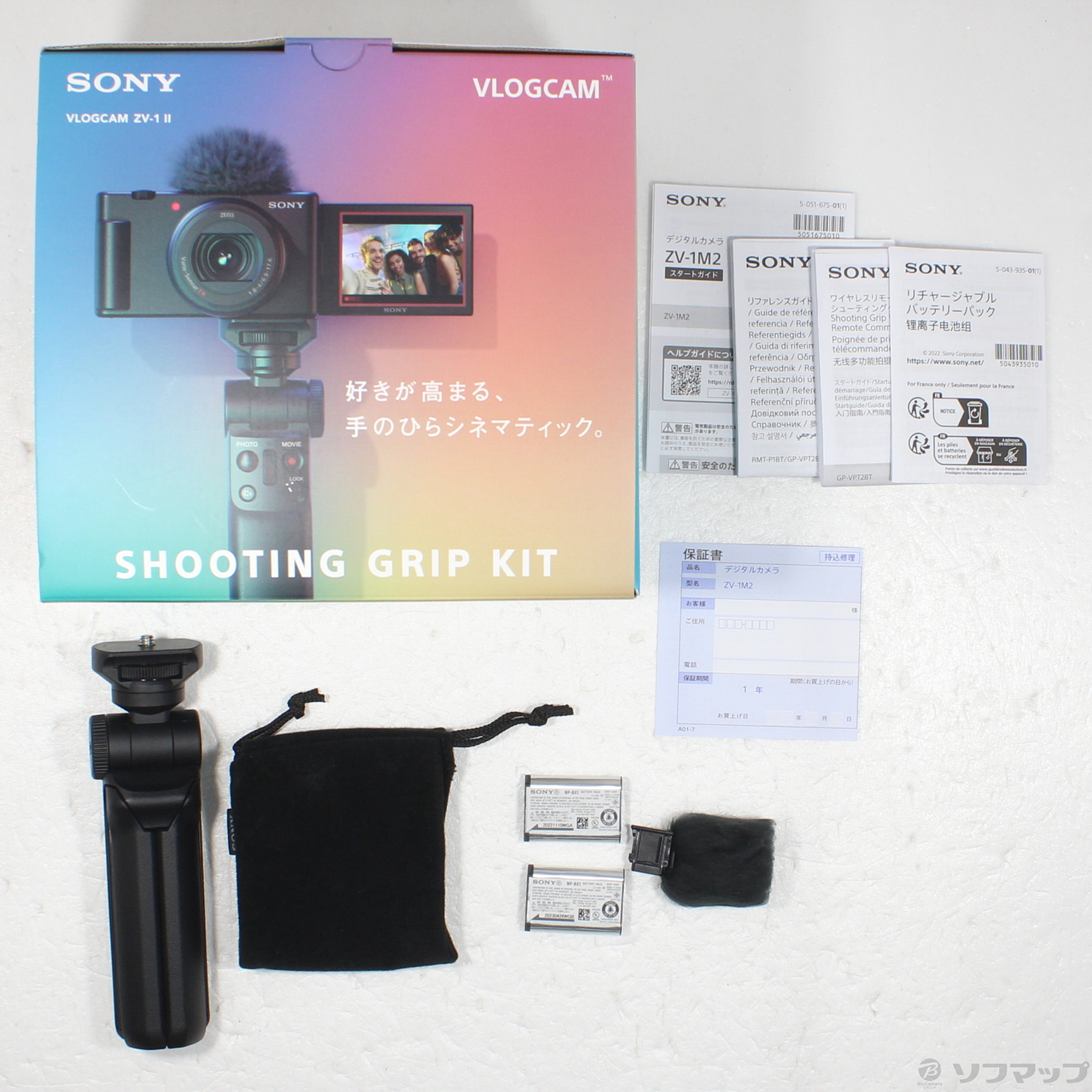ワイヤレスリモートコマンダー機能付シューティンググリップ、バッテリーパック(計2個 ※本体同梱分1個を含む)がセット。