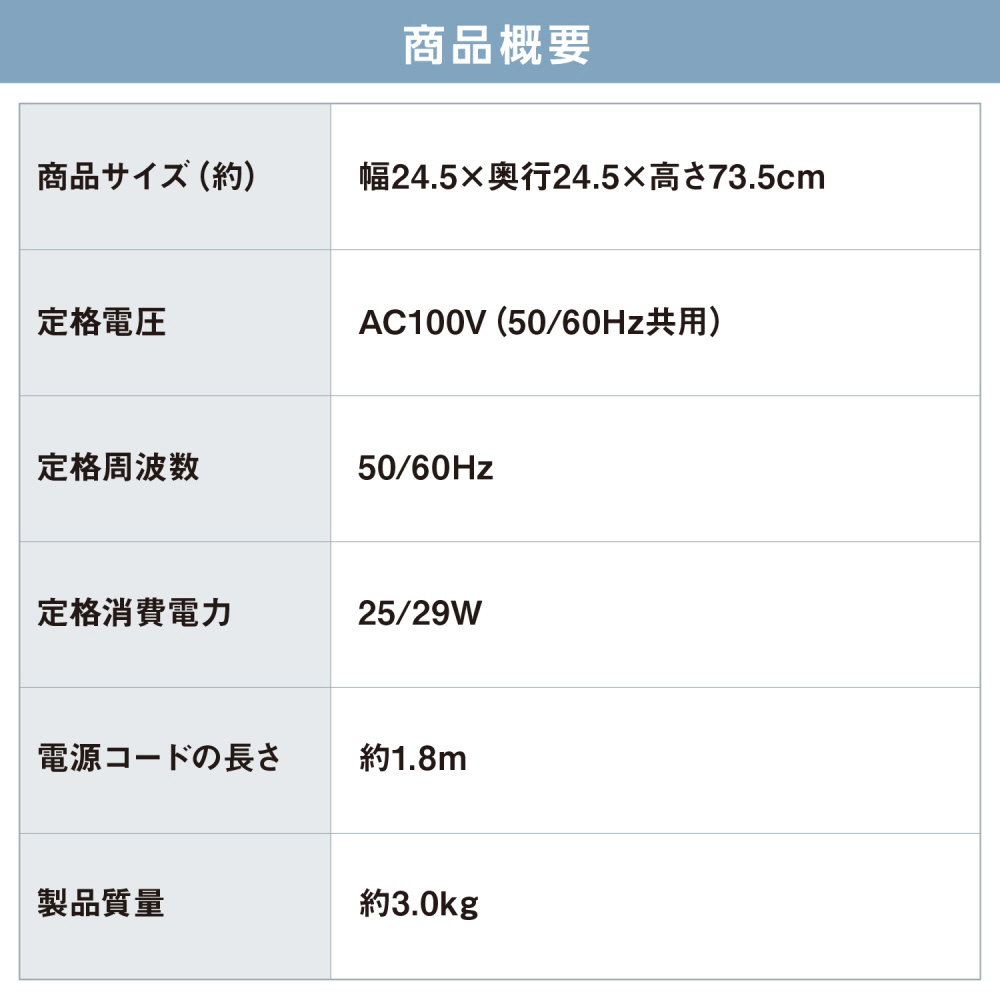 ■左右自動首振り機能付きで、風量が3段階調節(弱・中・強)でお好みの風量設定が可能です。