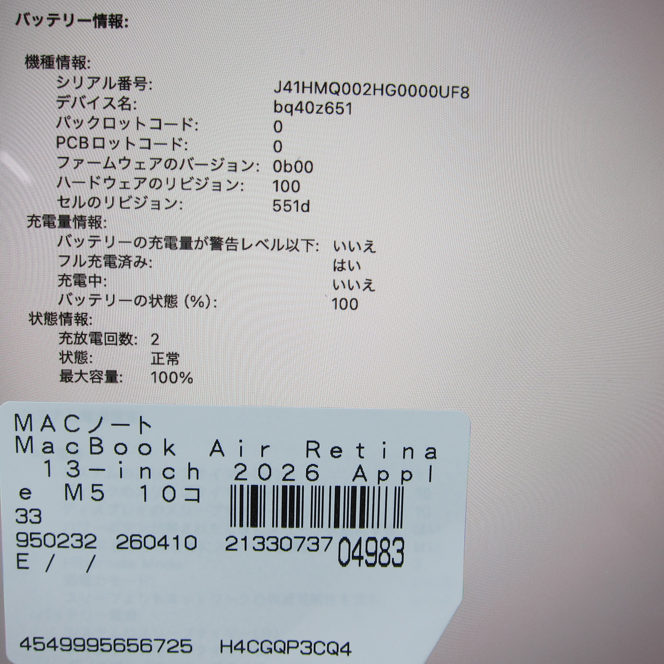 〔中古品〕 MacBook Air 13.6-inch Early-2026 MDHA4J/A Apple M5 10コアCPU_8コアGPU 16GB SSD512GB スターライト 〔26.3 Tahoe〕 [グラフィック:オンボード/JISキーボード]