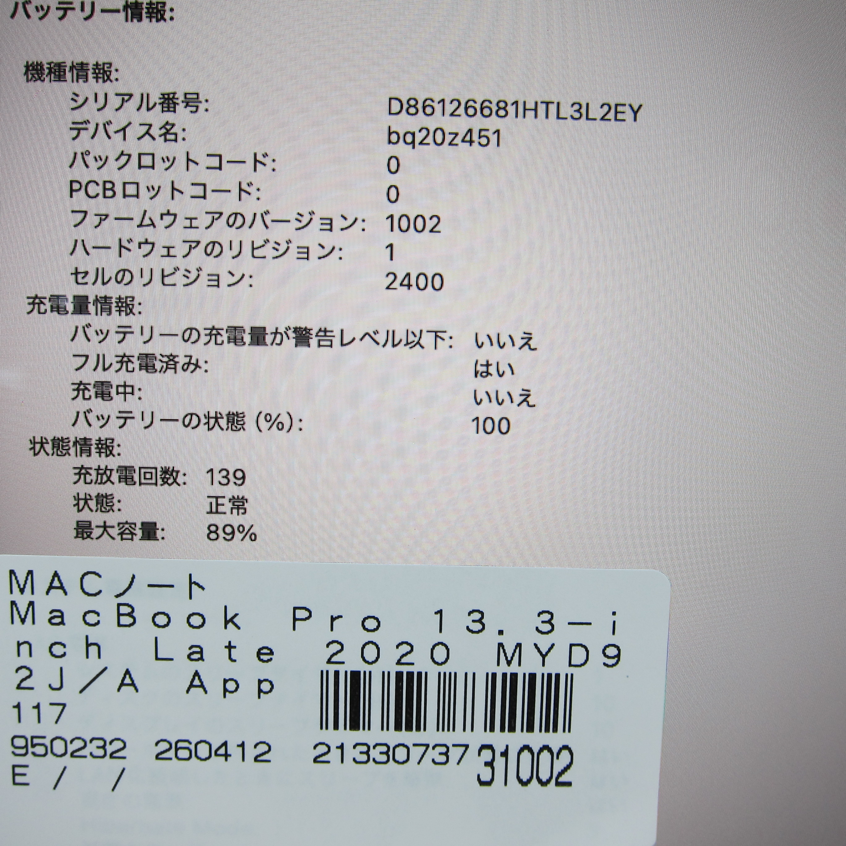 商品名 〔中古品〕 MacBook Pro 13.3-inch Late-2020 MYD92J/A Apple M1 8コアCPU_8コアGPU 16GB SSD512GB スペースグレイ 〔26.3 Tahoe〕 [グラフィック:オンボード/USキーボード]