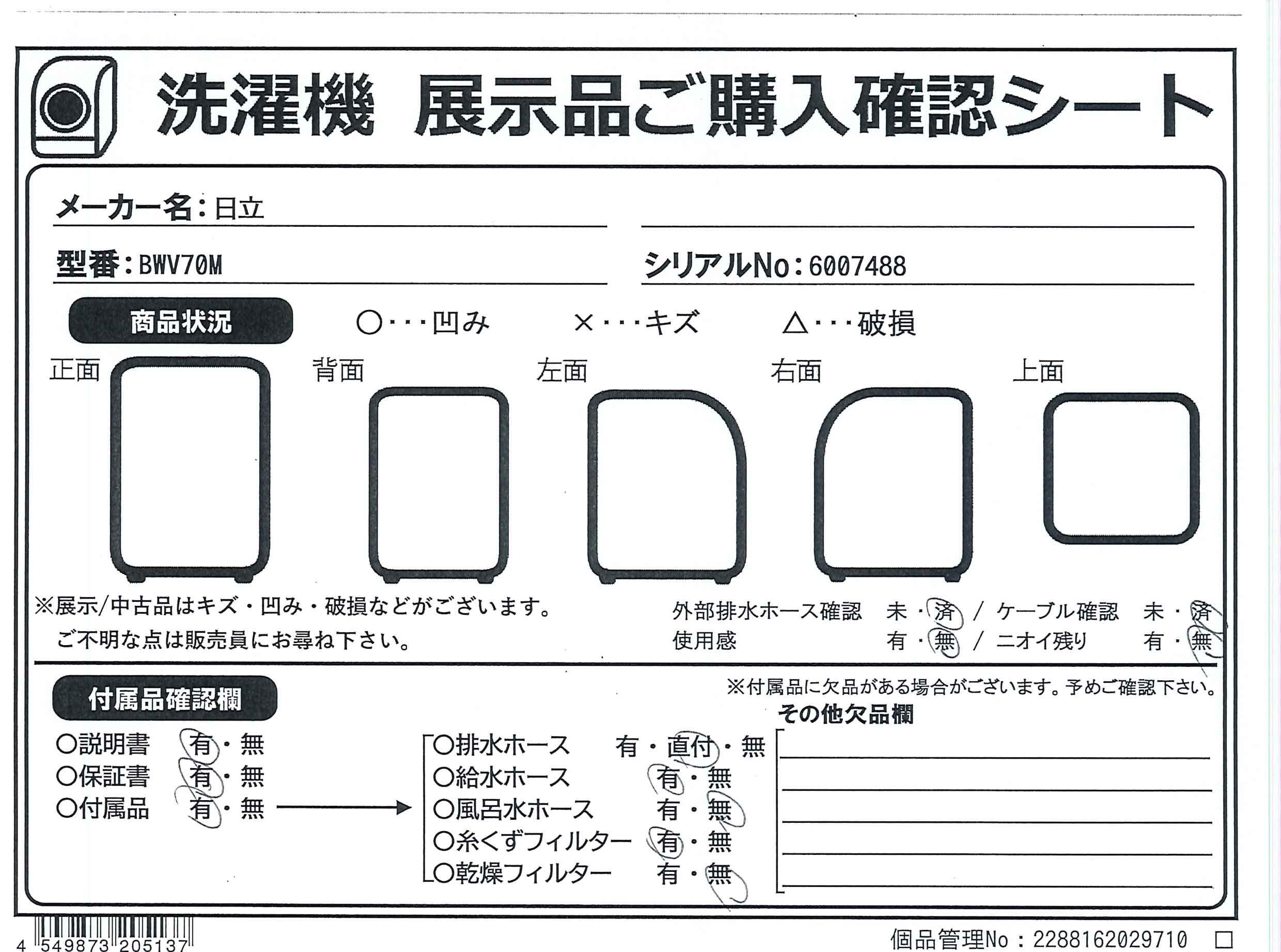 中古商品ランクについて 付属品・商品状態について 〔付属品〕取扱説明書、給水ホース、保護カバー、据付説明書
