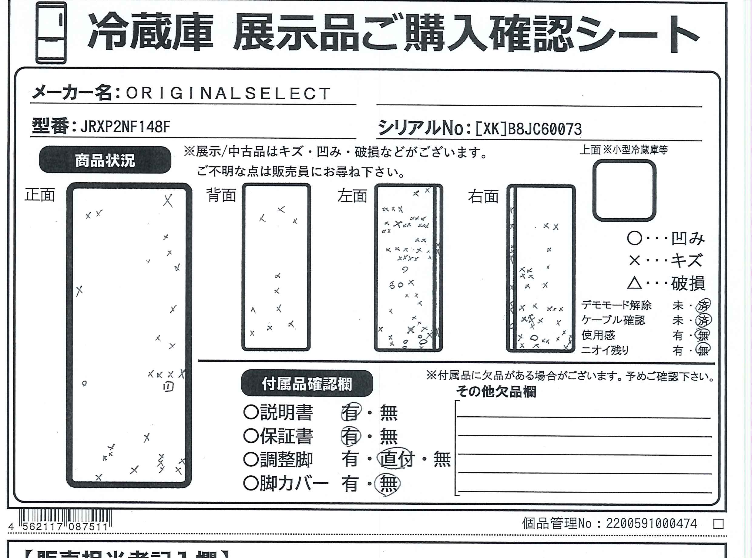 中古商品ランクについて 付属品・商品状態について 〔付属品〕説明書、卵ケース×2、ボトルポケット×2、冷蔵室棚×2、クリアケース、製氷皿セット、冷凍室上トレイ、冷凍室バスケット(小)、冷凍室バスケット(大)、調節脚×2