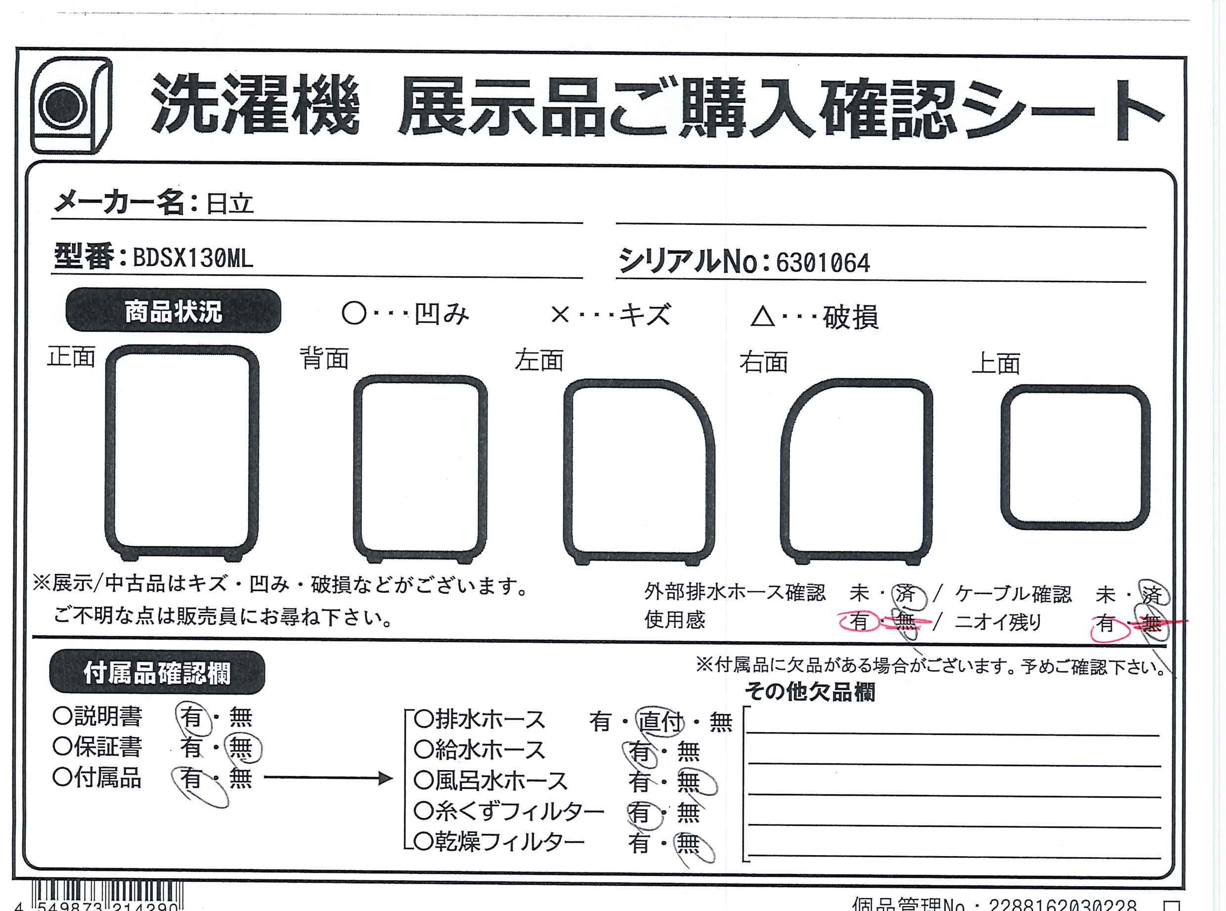 中古商品ランクについて 付属品・商品状態について 〔付属品〕取扱説明書、据付説明書、給水ホース(約 0.8m)、カバー×4、輸送用ボルト×4
