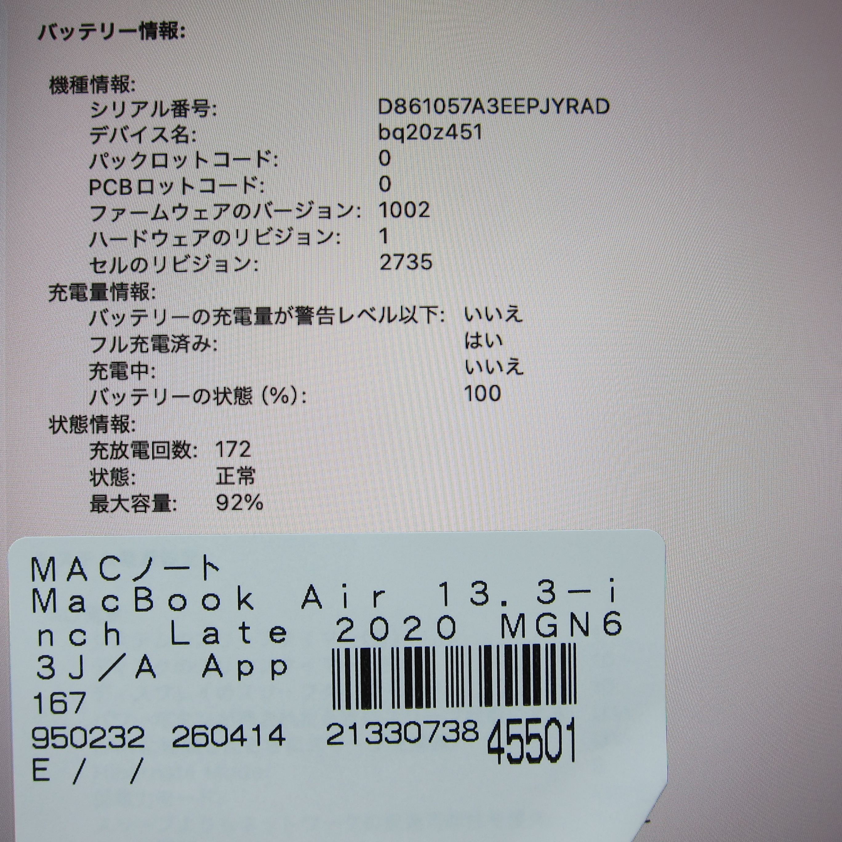 〔中古品〕 MacBook Air 13.3-inch Late-2020 MGN63J/A Apple M1 8コアCPU_7コアGPU 8GB SSD256GB スペースグレイ 〔26.3 Tahoe〕 [グラフィック:オンボード/USキーボード]