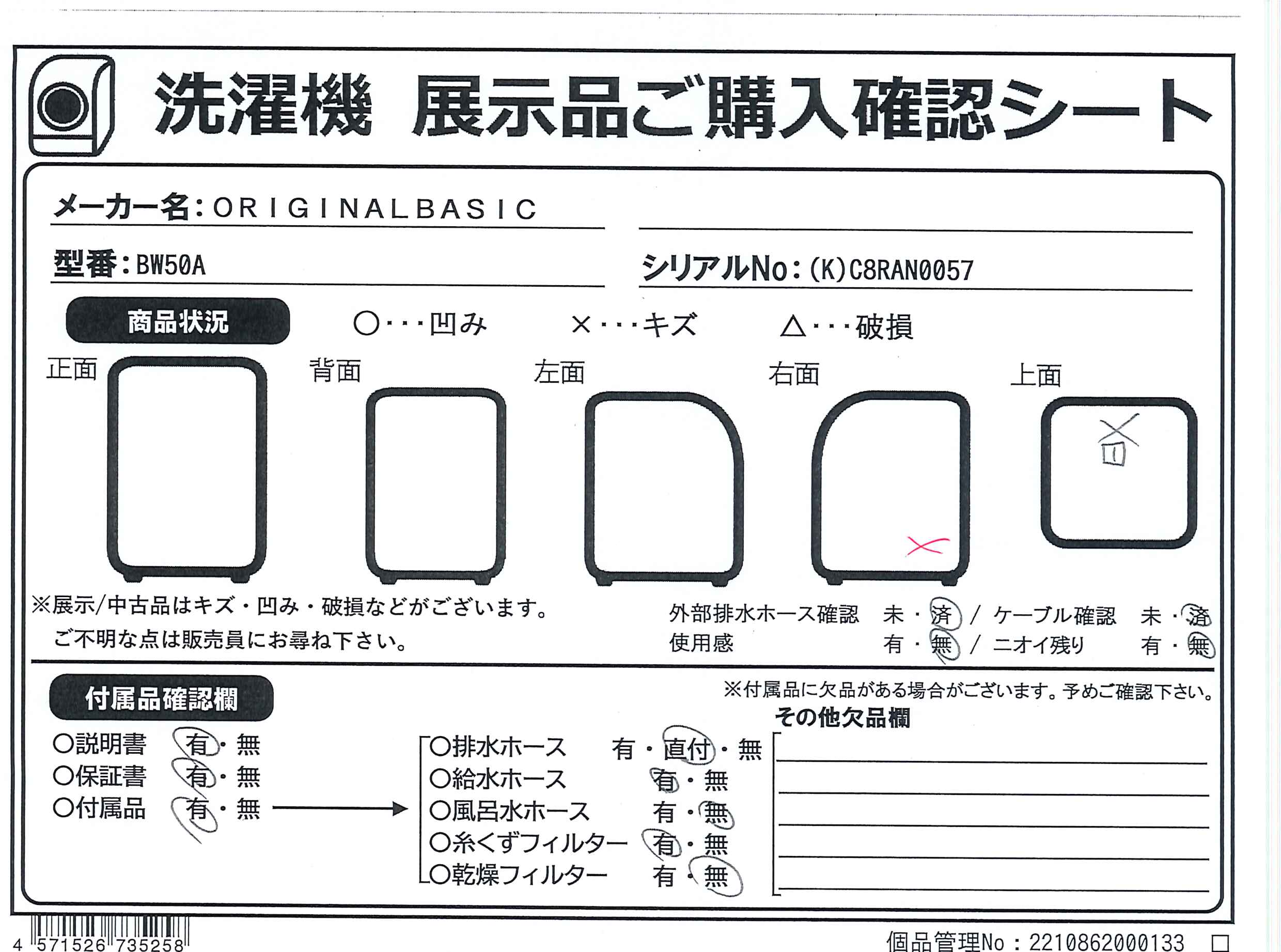 中古商品ランクについて 付属品・商品状態について 〔付属品〕説明書、マジックつぎ手、給水ホース、糸くずフィルター、底カバー、底カバー用ネジ
