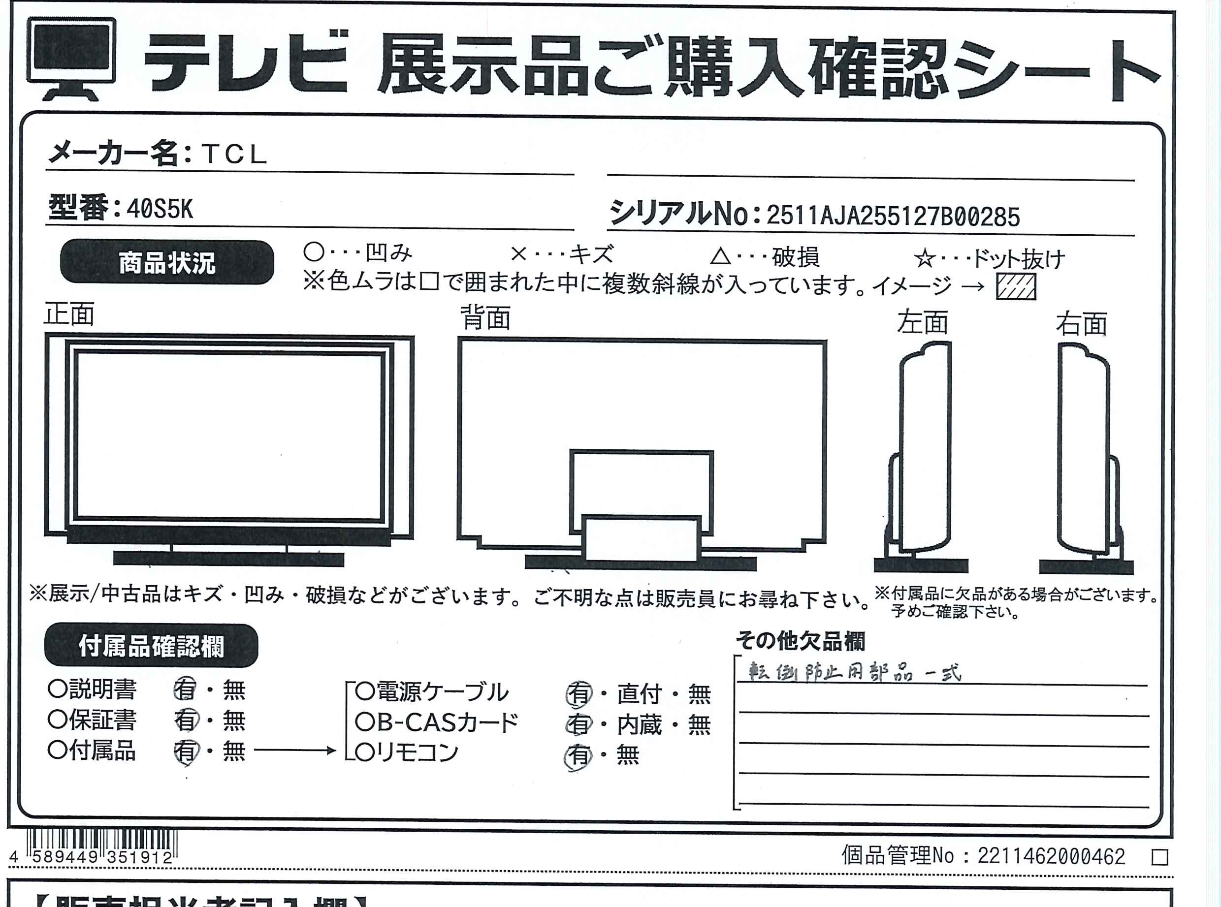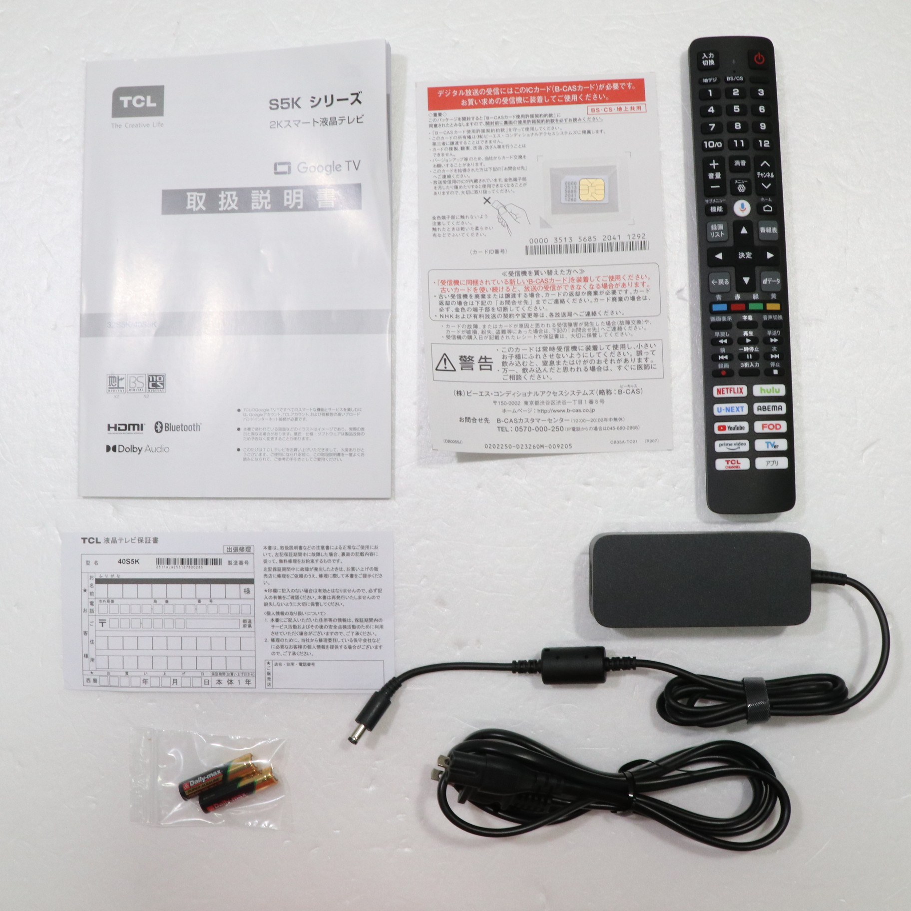 中古商品ランクについて 付属品・商品状態について 〔付属品〕説明書、かんたんガイド、リモコン、単四形乾電池×2、miniB-CASカード、電源コード、アダプター、スタンド、ネジ(ST4)(25mm)×4