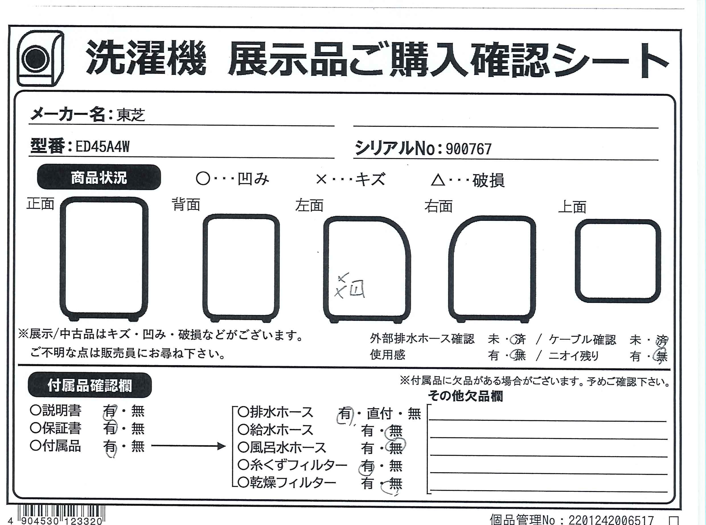 中古商品ランクについて 付属品・商品状態について 〔付属品〕説明書、排水ホース、ホースバンド