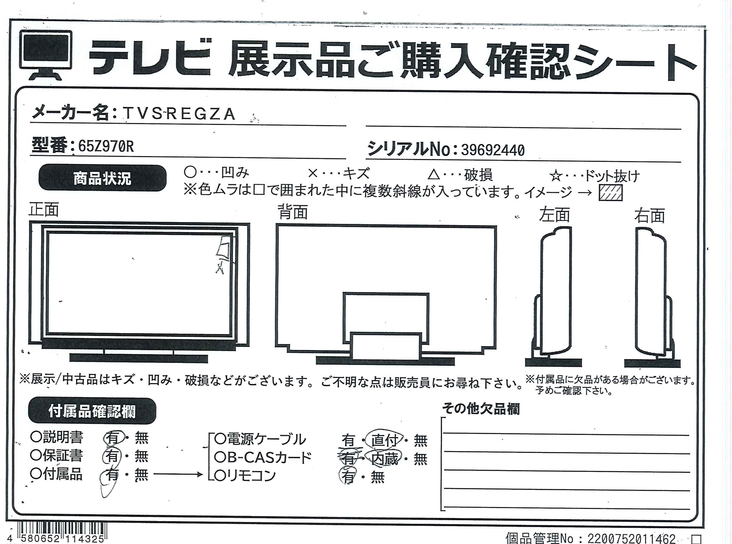 中古商品ランクについて 付属品・商品状態について 〔付属品〕取扱説明書、支柱、スタンドベース、スタンド組立・取付ネジ(M5ネジ)×8、リモコン、単四形乾電池×2、電源コード、転倒防止バンド1式、コードクランプ