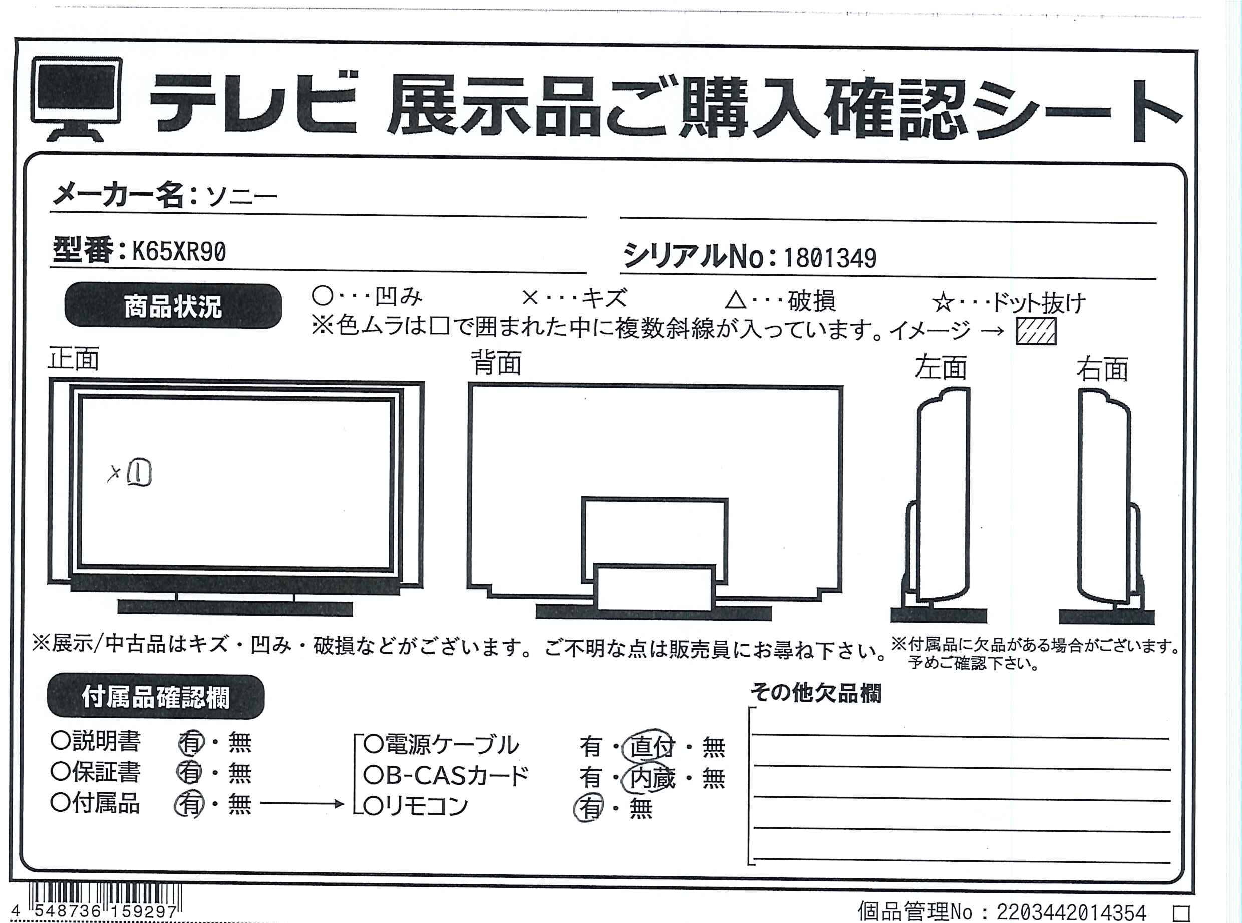 中古商品ランクについて 付属品・商品状態について 〔付属品〕取扱説明書、組み立て/設置ガイド、製品登録のおすすめ(製品のサポート登録)、スタンド(SB1)、スタンド(SB2)、スタンド用ネジ×4(M5L12)、リモコン、リモコン用乾電池×2、背面カバー(CC)、背面カバー(CD1)、背面カバー(CD2)、背面カバー(CD3)、背面カバー(CD4)、背面カバー(KB)、ケーブルカバー(CD5)、転倒落下防止ベルト一式(FB)、光角形/光ミニプラグ変換アダプター、クランパー×2
