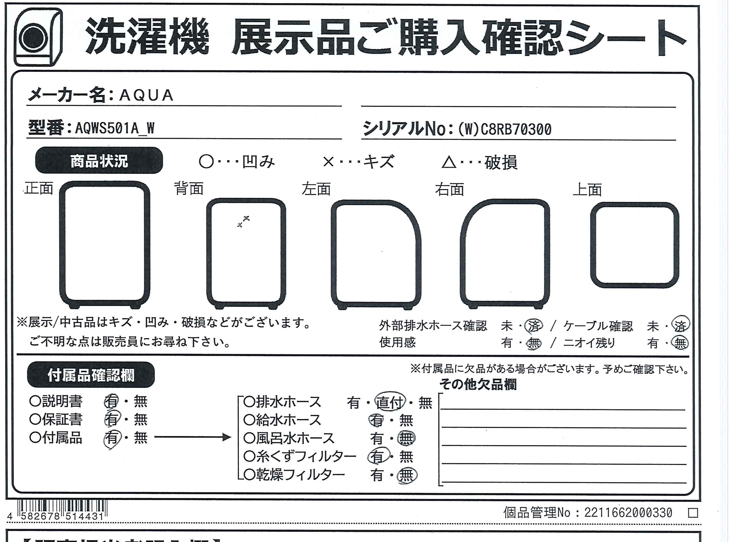 中古商品ランクについて 付属品・商品状態について 〔付属品〕取扱説明書、据付説明書、糸くずフィルター、底カバー、底カバー用ネジ、給水ホース(長さ 約80cm)、マジックつぎ手