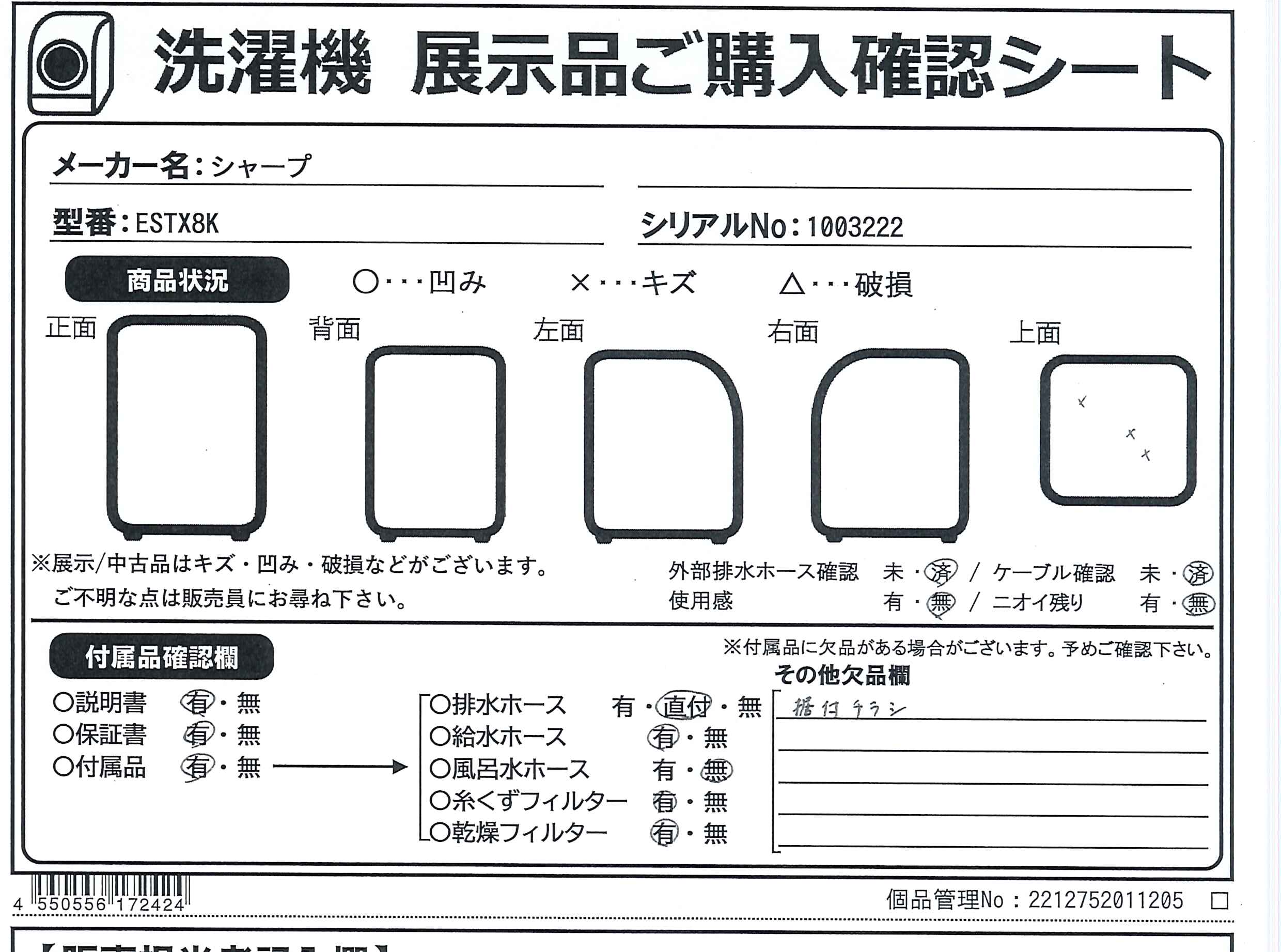 中古商品ランクについて 付属品・商品状態について 〔付属品〕説明書、給水ホース、水栓つぎて、脚スペーサー6mm(接着テープ×2つき)、ハンガー、底カバー、底カバー取付ねじ×6、底カバー取付説明書