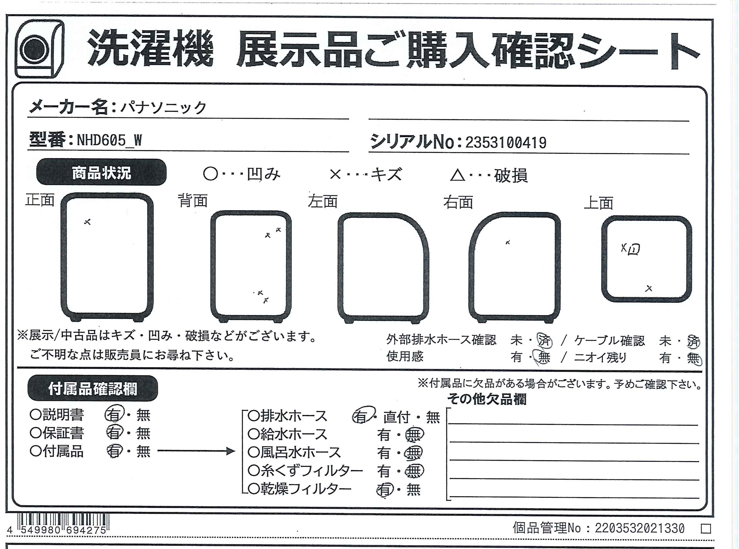 中古商品ランクについて 付属品・商品状態について 〔付属品〕取扱説明書、施工説明書、ユニット台取り付け用ネジ×4、排水ホース(ホースバンド付き)、排水パイプ、ホースホルダー、フィルターカバー、ネットフィルター、不織布フィルター