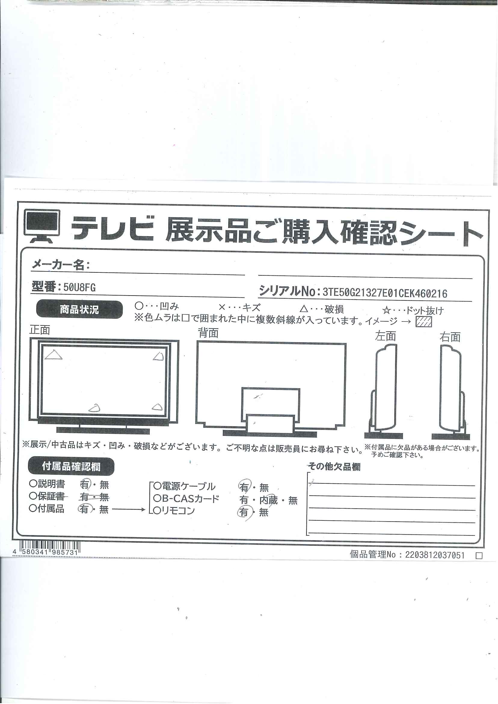 〔ジャンク品〕 液晶テレビ 50U8FG [50V型 /4K対応 /BS・CS 4Kチューナー内蔵 /YouTube対応]