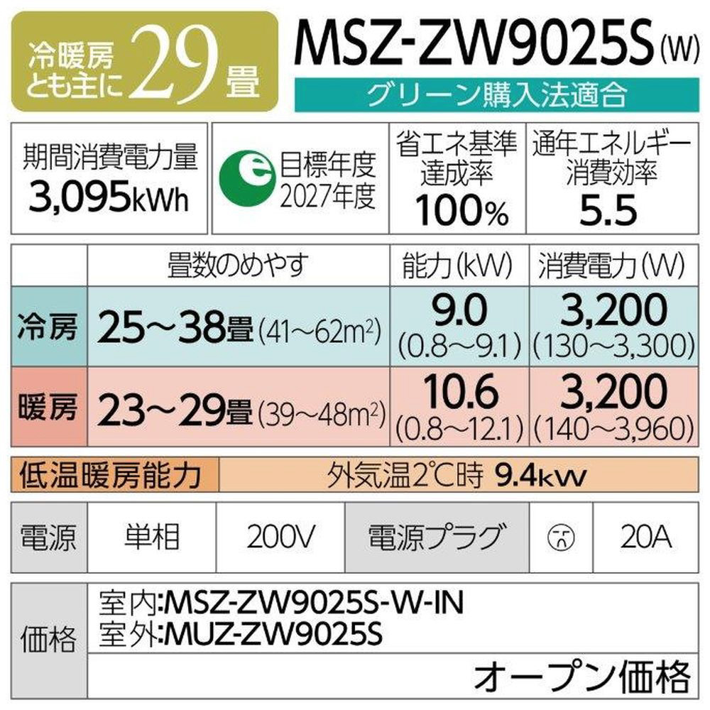 エアコン室内機 MSZ-ZW9025S-W [200V] (単品購入不可)【プレミアム工事対象】