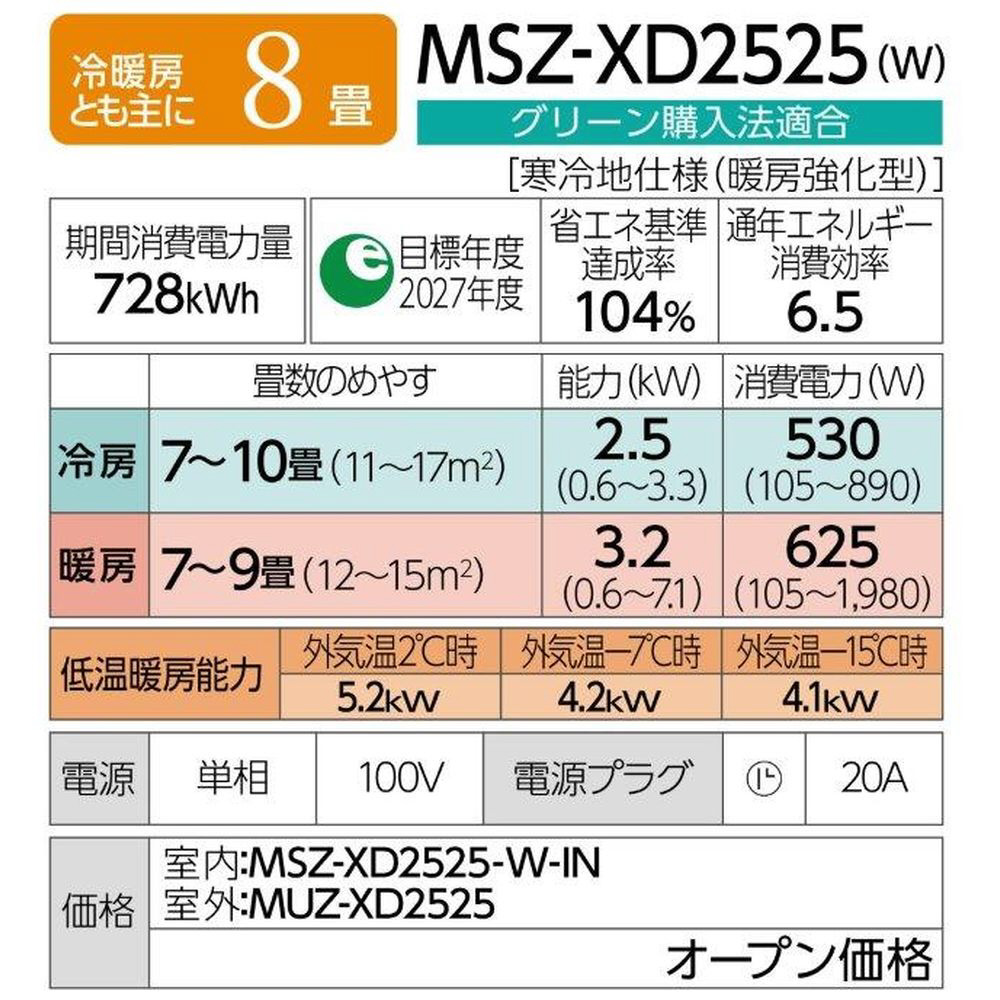 エアコン 2025年 ズバ暖 霧ヶ峰 XDシリーズ ピュアホワイト MSZ-XD2525-W [おもに8畳用 /100V /極暖・寒冷地仕様] 【買い替え5000pt】【プレミアム工事対象】