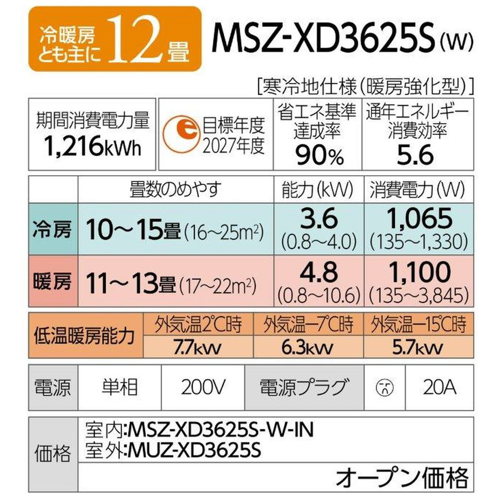 エアコン 2025年 ズバ暖 霧ヶ峰 XDシリーズ ピュアホワイト MSZ-XD3625S-W [おもに12畳用 /200V /極暖・寒冷地仕様] 【買い替え5000pt】【プレミアム工事対象】