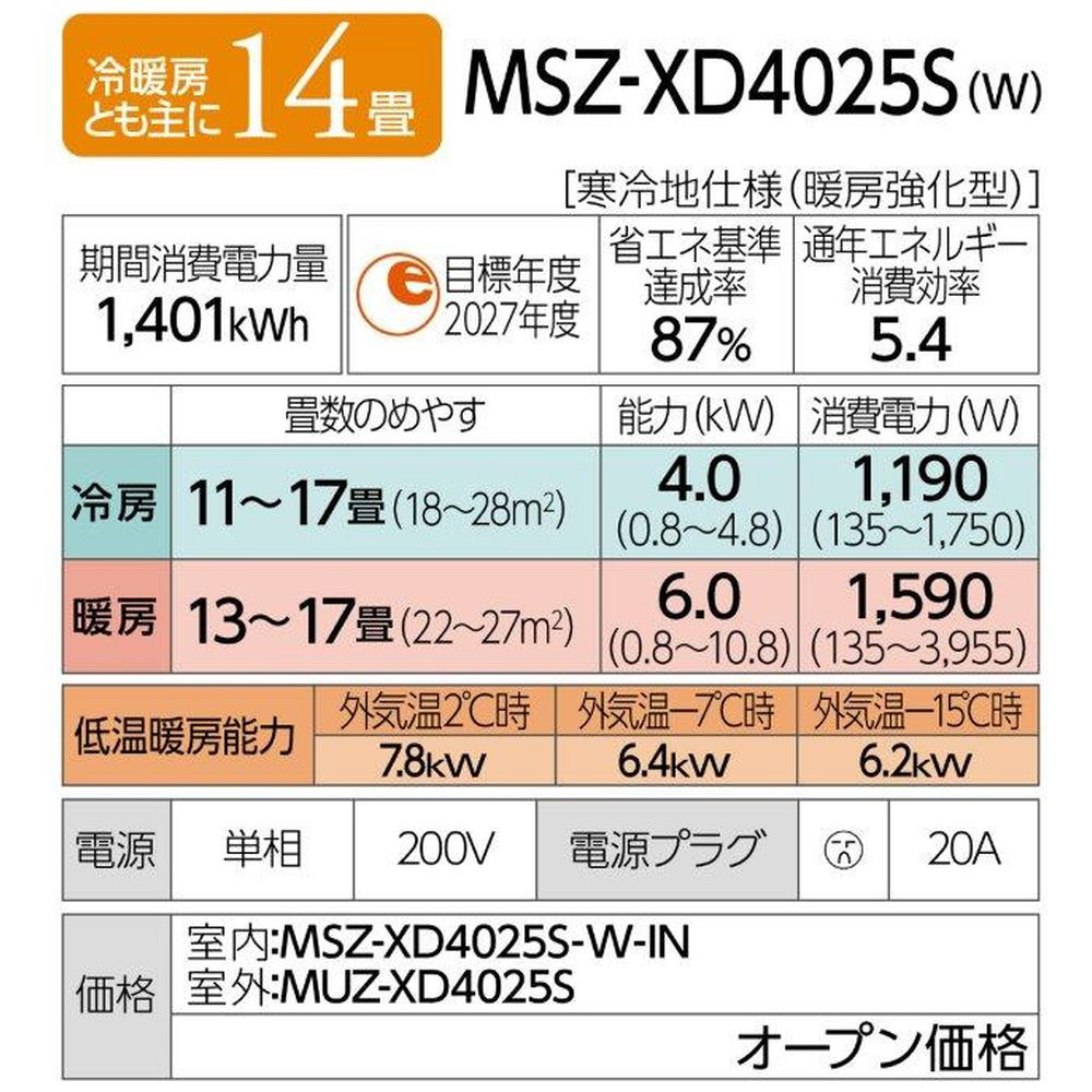エアコン 2025年 ズバ暖 霧ヶ峰 XDシリーズ ピュアホワイト MSZ-XD4025S-W [おもに14畳用 /200V /極暖・寒冷地仕様] 【買い替え5000pt】【プレミアム工事対象】