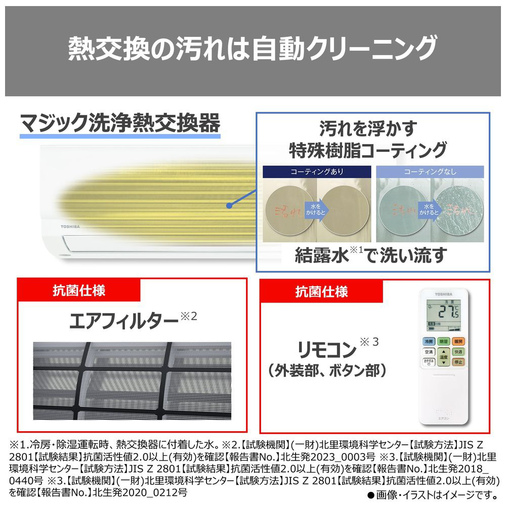 ※1 東芝ライフスタイル独自の条件により評価。【試験機関】(一財)北里環境科学センター【試験方法】熱交換器に菌(1種類)を付着させ手動クリーニング運転を実行。クリーニング前後の菌数を測定し比較。【試験結果】99%減少【報告書No.】北生発2022_0384号