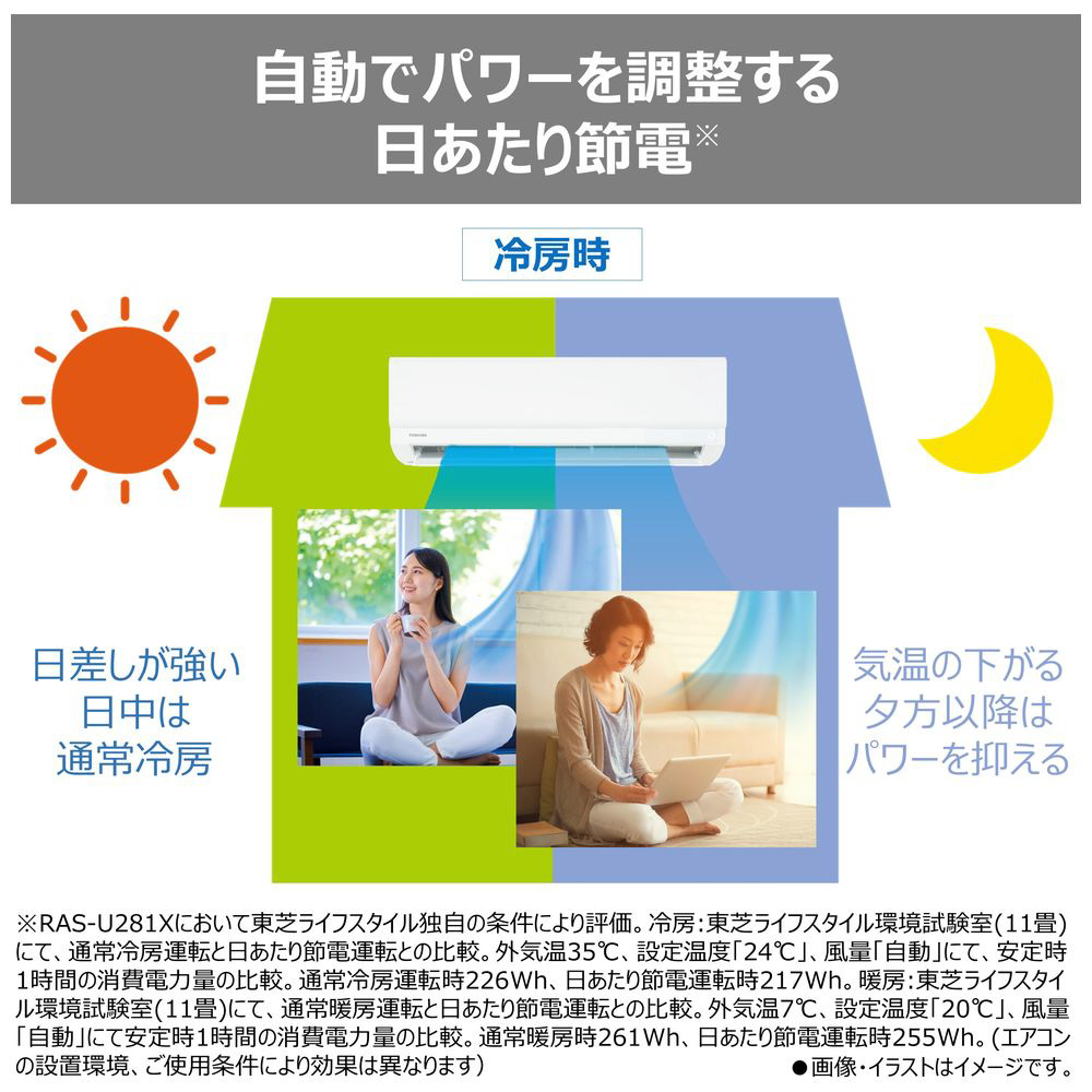 ※ RAS-U281Xにおいて東芝ライフスタイル独自の条件により評価。冷房:東芝ライフスタイル環境試験室(11畳)にて、通常冷房運転と日あたり節電運転との比較。外気温35℃、設定温度「24℃」、風量「自動」にて、安定時1時間の消費電力量の比較。通常冷房運転時226Wh、日あたり節電運転時217Wh。暖房:東芝ライフスタイル環境試験室(11畳)にて、通常暖房運転と日あたり節電運転との比較。外気温7℃、設定温度「20℃」、風量「自動」にて安定時1時間の消費電力量の比較。通常暖房時261Wh、日あたり節電運転時255Wh。(エアコンの設置環境、ご使用条件により効果は異なります)