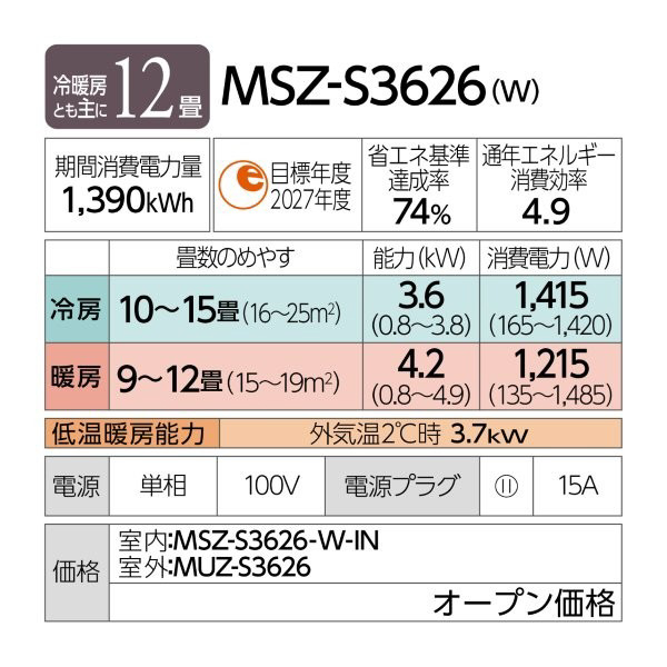 エアコン 2026年 霧ヶ峰 Sシリーズ ピュアホワイト MSZ-S3626-W [おもに12畳用 /100V] 【買い替え3000pt】【プレミアム工事対象】