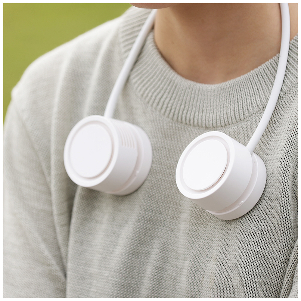 首にかけて両手を自由に使える扇風機! 収納に便利なポーチ付き。