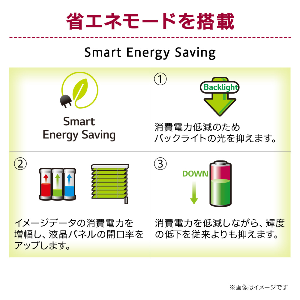 消費電力を抑えつつ明るさを維持するため、バックライトの明るさを抑ながら入力信号を増幅させ、さらに液晶パネルの開口率をあげることで、輝度の低下を従来よりも低減させます。