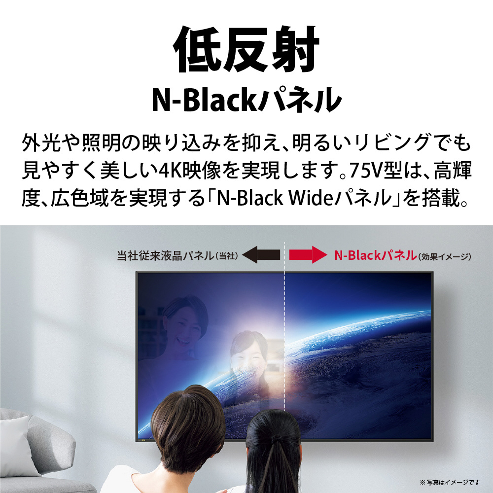 外光や照明の映り込みを抑え、明るいリビングでも見やすく美しい4K映像を実現します。75V型は、高輝度、広色域を実現する「N-Black Wideパネル」を搭載。