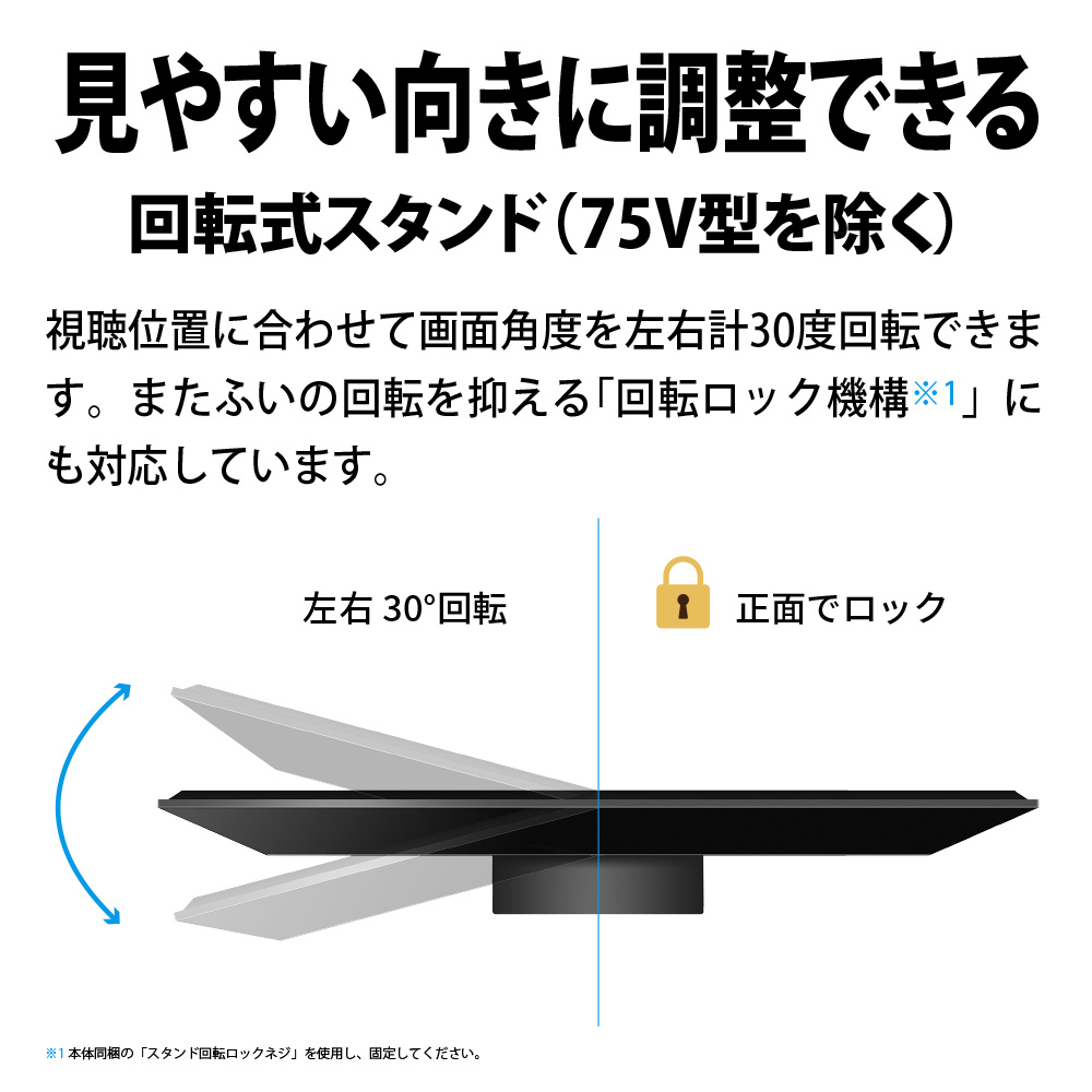 視聴位置に合わせて画面角度を左右計30度回転できます。またふいの回転を抑える「回転ロック機構※1」にも対応しています。