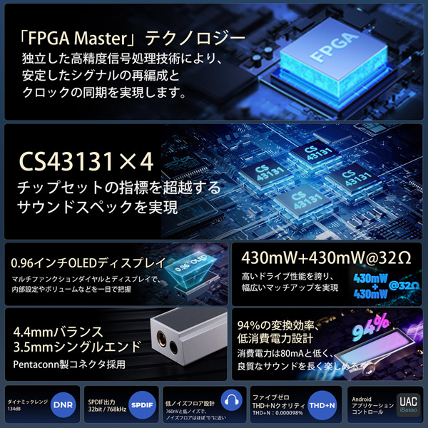 CS43131を4基採用。チップセットの指標を超越するサウンドスペックを実現。