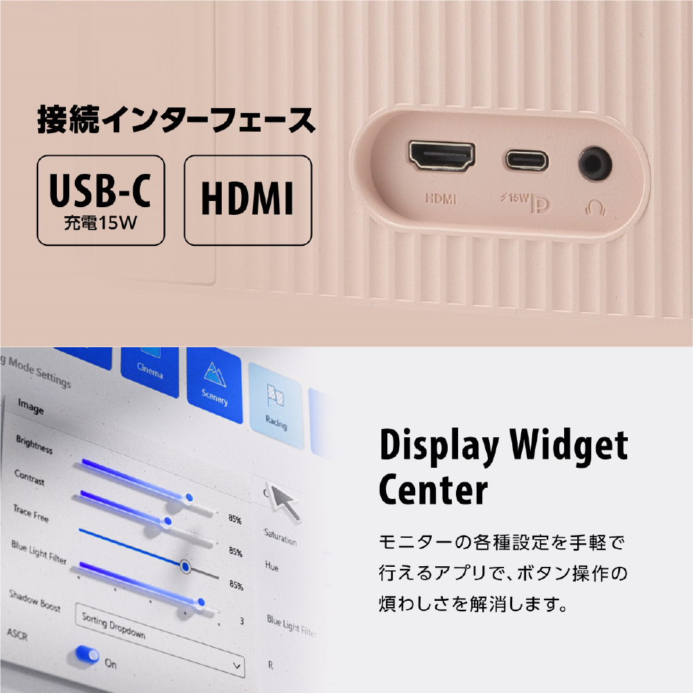 24型、FHD (1920 x 1080)、IPS、100Hz、Adaptive-Sync、USB-C充電15W、環境サステナビリティ、DisplayWidget Center、4色展開、EyeCare Plusテクノロジー