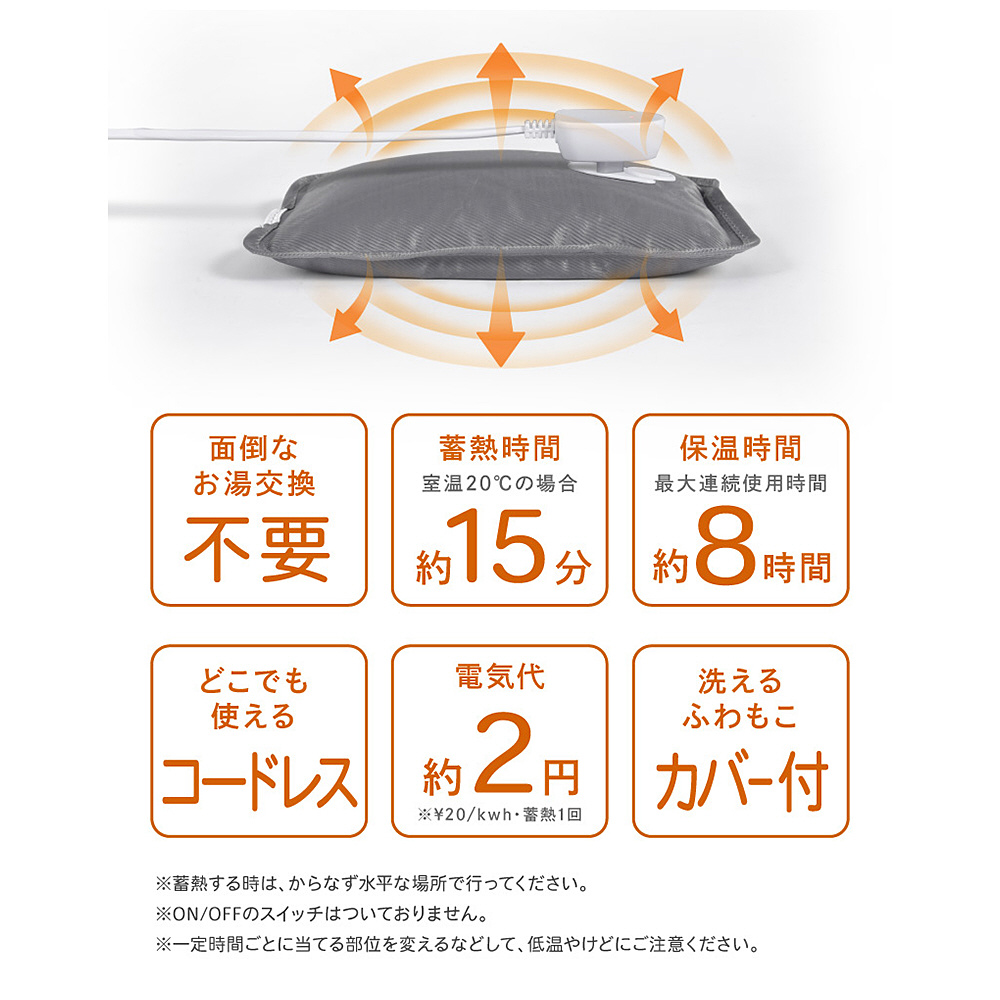 約15〜20分のAC電源からの蓄熱で、最大約8時間の保温。1回の蓄熱費用は約2円!エシカルで、サステナブルなグッズです。