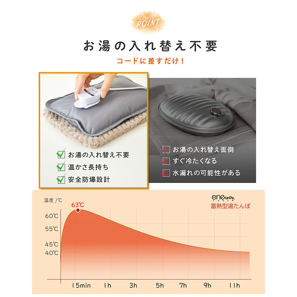 蓄熱終了後はコードレスでどこにでも持っていくことができ、AC電源さえあればぬるくなったエネタンポもすぐに熱々に!