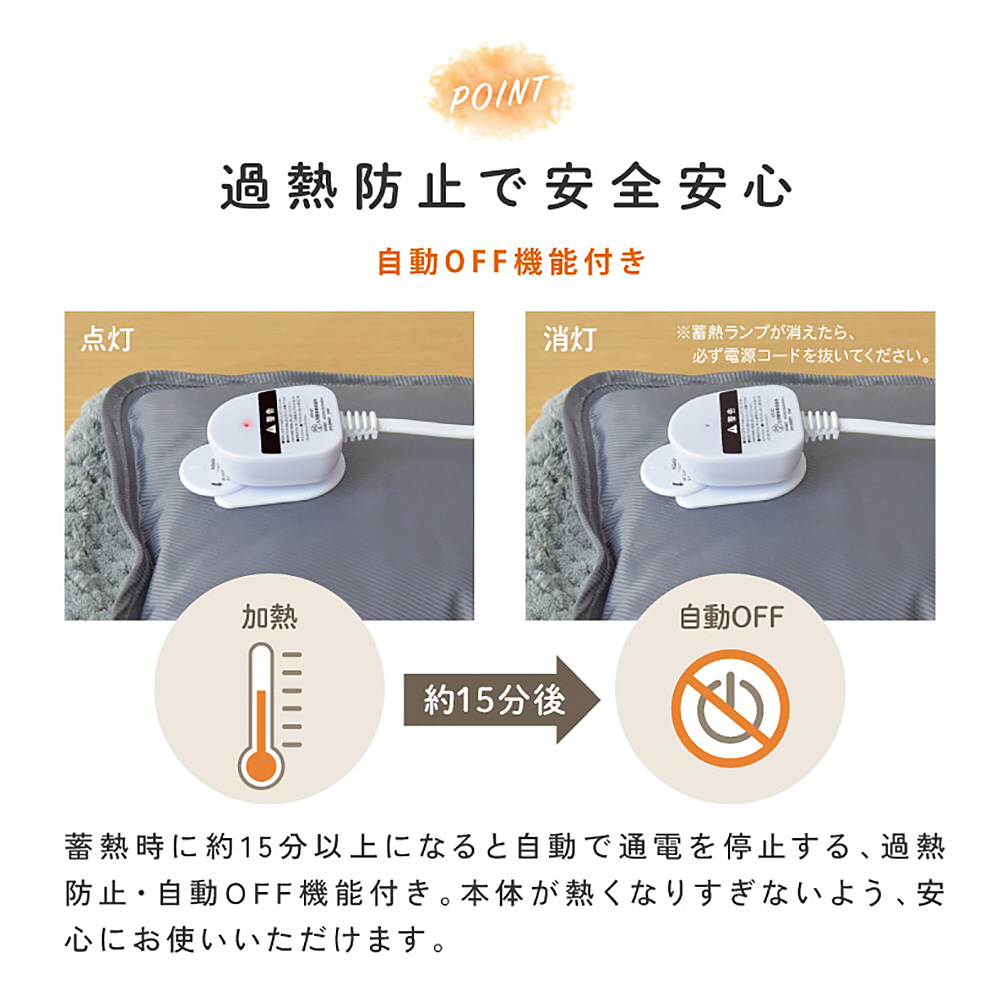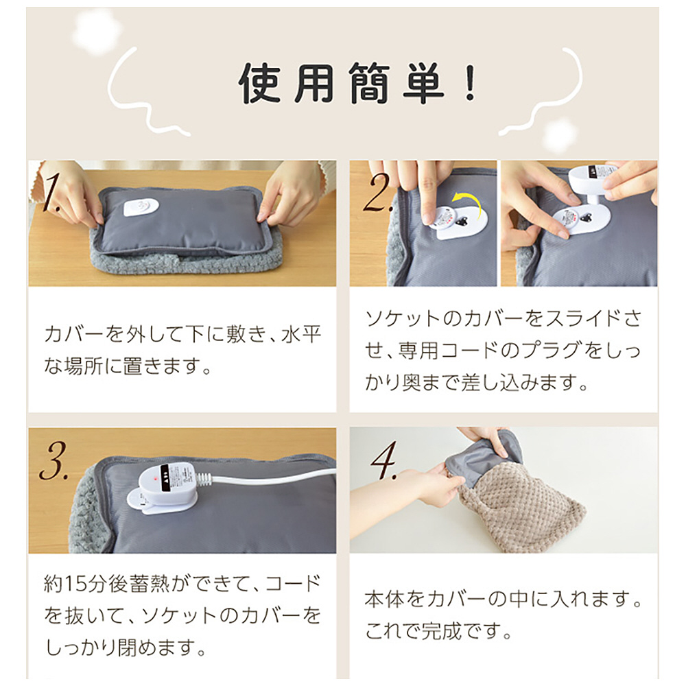 ●専用コードを繋いで、AC電源に繋ぐだけ!設定温度になると自動で電源OFF。誰でも簡単に扱えます。