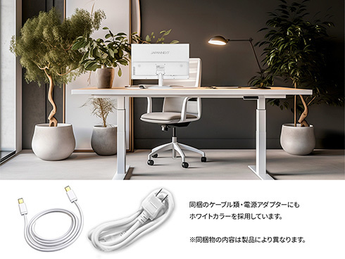 ■本体カラーにホワイトを採用。モニターベゼルやスタンドも白となっており、爽やかでおしゃれな空間を演出したい場合や、デバイスを白で統一したい場合に最適です。さらに、付属のケーブルや電源アダプターにもホワイトカラーを採用。全体が白基調に統一された部屋や医療機関などでの使用にも最適です。