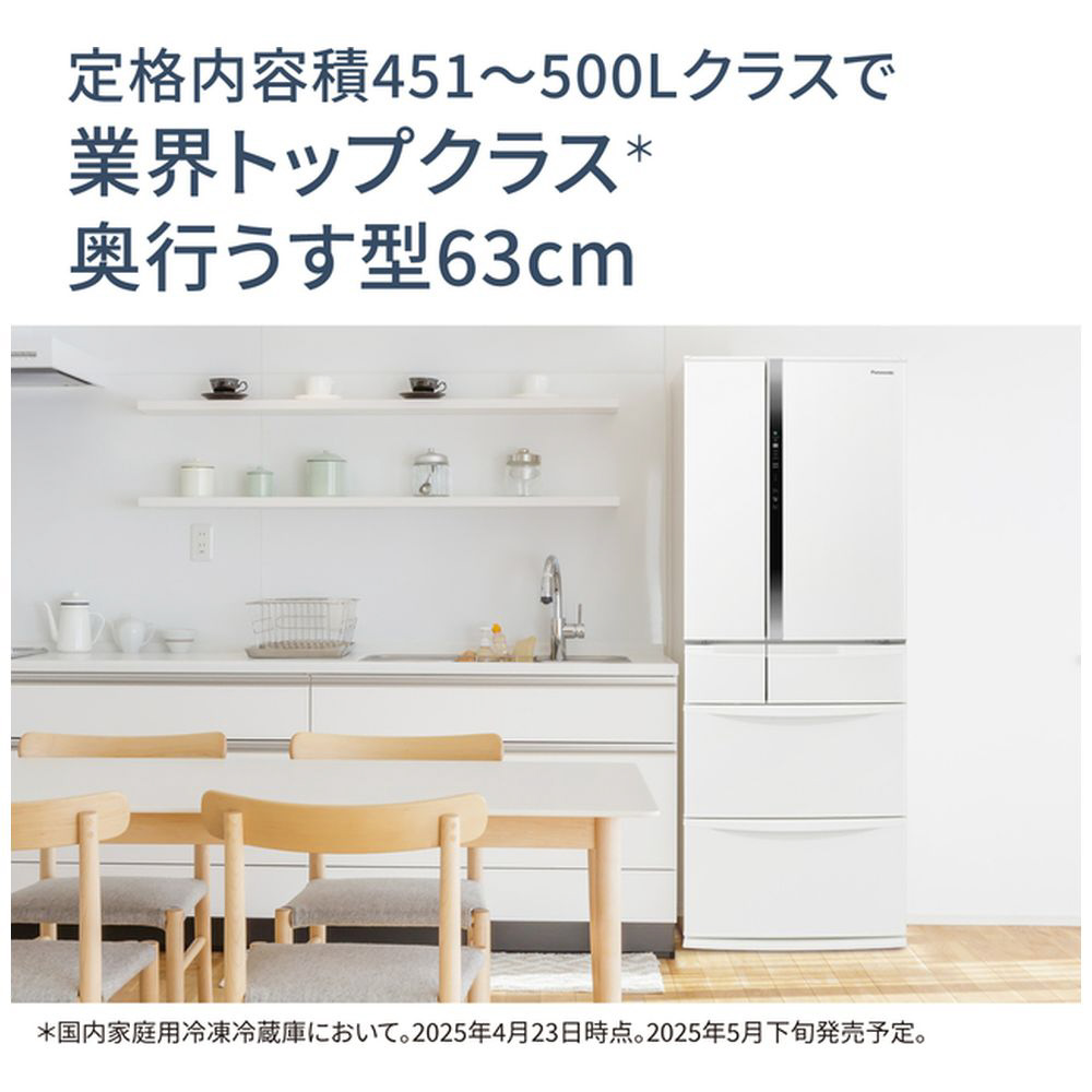 定格内容積451L〜500Lクラスで、コンパクトキッチンにもすっきり収まる、フレンチドア奥行うす型63cm。