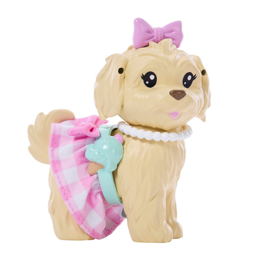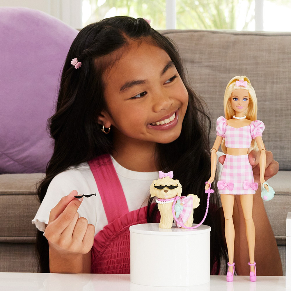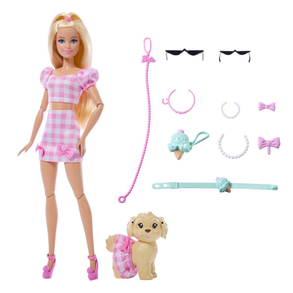 バービーとペットの子いぬは、ピンクのギンガムチェックのコーディネートでおそろい。