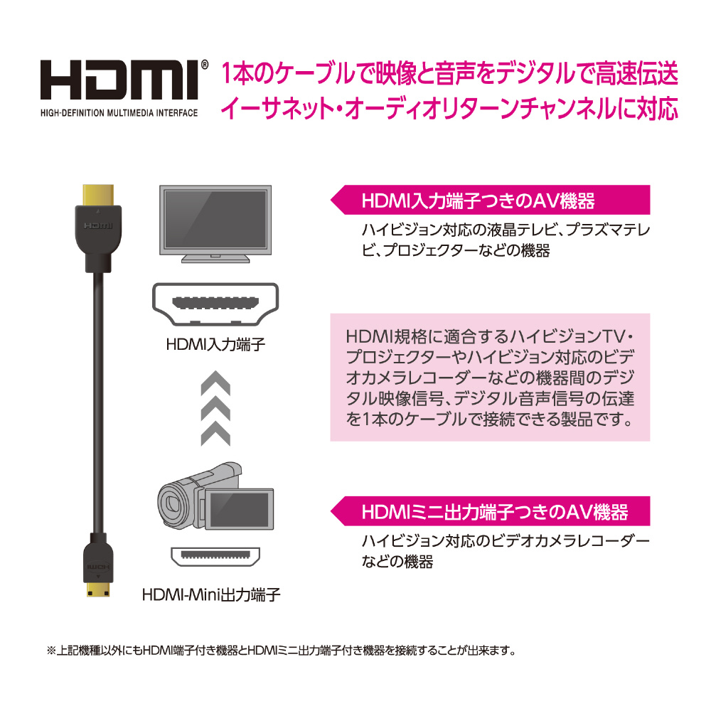 HDMIの最新規格にフル対応し、映像信号と音声信号に加え100Mbpsのイーサネット通信を実現する!「HDMI-Mini出力端子(Type C)」に接続できる、HIGH SPEED with Ethernet認証済み“イーサネット対応HIGH SPEED HDMI-Miniケーブル"。