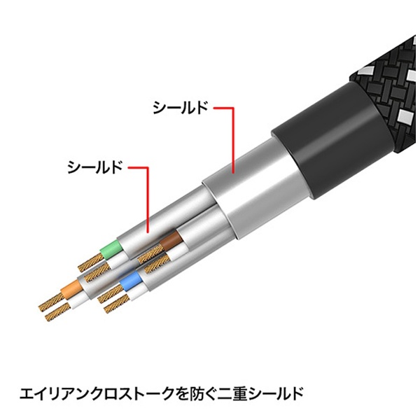 ■ギガビット以上での通信を行う際、複数本束ねると互いに干渉し、著しく性能が低下して通信エラーが発生します。これを「エイリアンクロストーク(ANEXT)」と言います。CAT7ケーブルは各4対のペアと外周をそれぞれシールドする「二重シールド」構造のため、複数本束ねた状態での使用が可能になります。