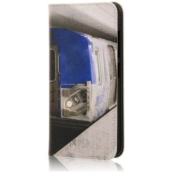 内側にはICカードポケットの付いた薄くてスリムなレザーに、キャラクターデザインがプリントされた手帳型ケース。