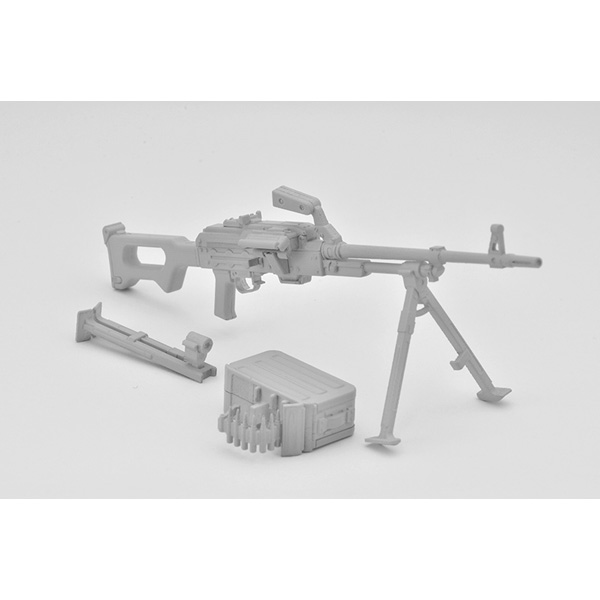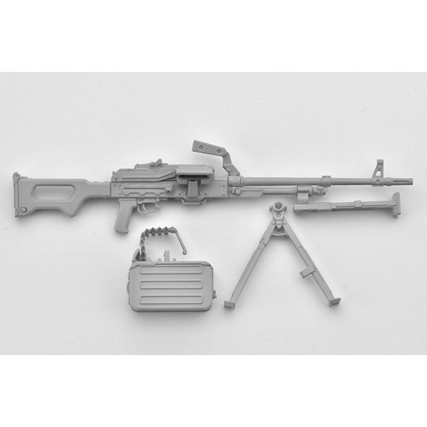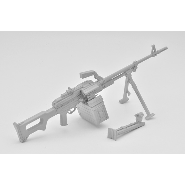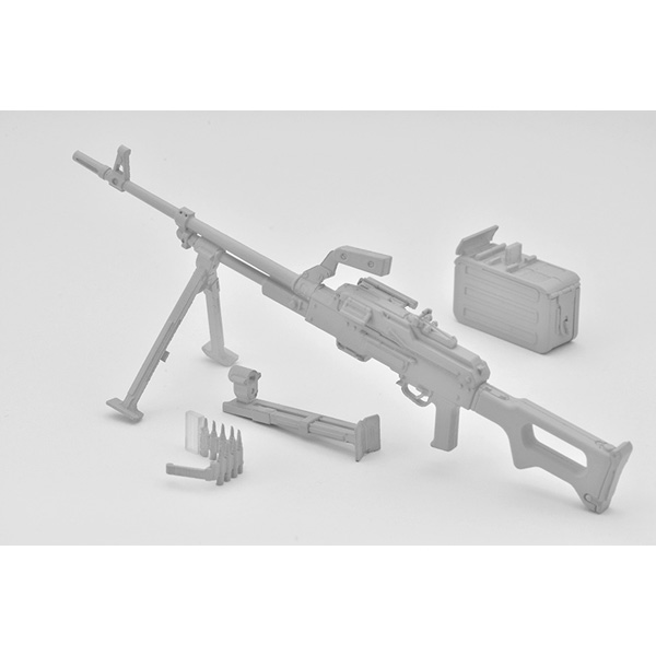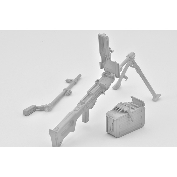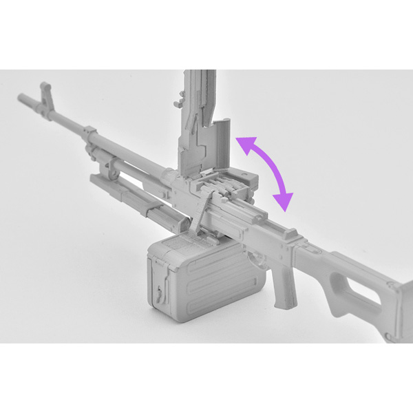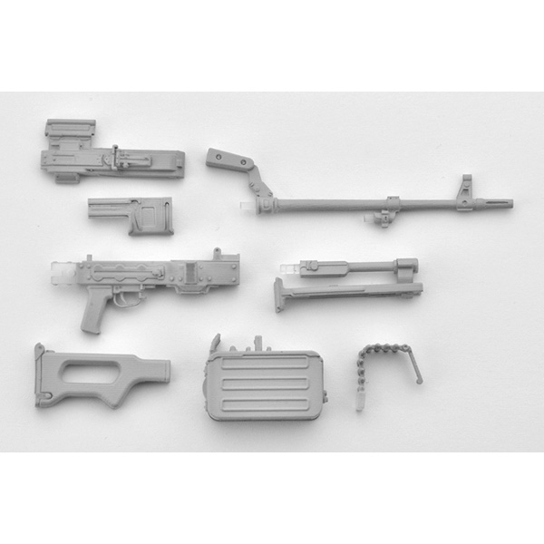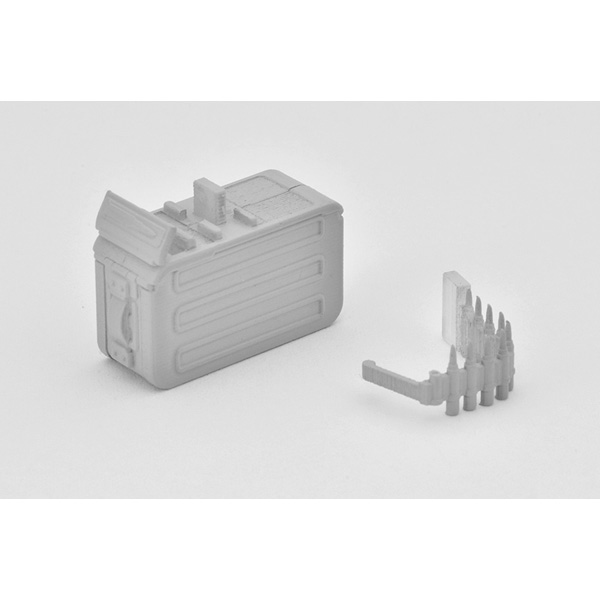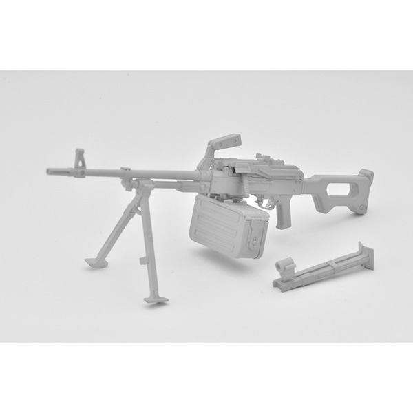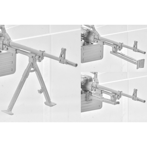 当キットでは、開閉選択式の2脚。100連弾薬箱と、特徴的な右からの給弾を再現したスタータータブ付ベルトリンクが付属。銃床と弾薬箱は別色。