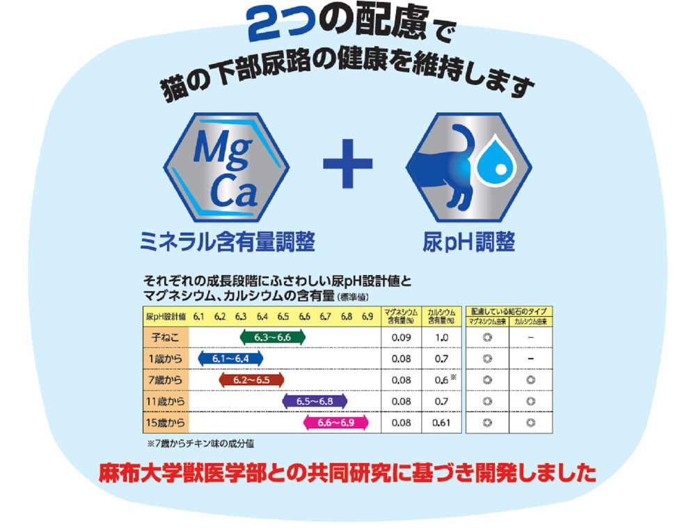 猫の臨床栄養学から生まれた下部尿路の健康維持フード。マグネシウムとカルシウムの適正バランス、尿pHのコントロールなど、成長段階にあった栄養設計をしています。