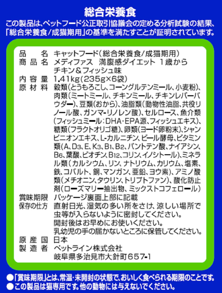 メディファス 満腹感ダイエット 1歳から チキン&フィッシュ味 1.41kg(235g×6)