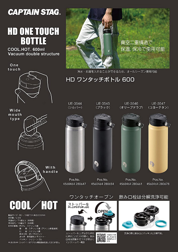 キャプテンスタッグ【HDボトル】シリーズ!真空二重構造で保温、保冷で使用可能。冷水・お湯を入れることができるため、オールシーズン使用可能。