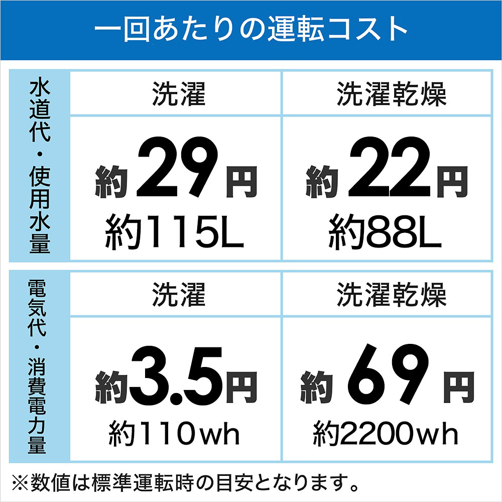 | 消費電力量 | 110Wh/2200Wh(洗濯/洗濯〜乾燥) |