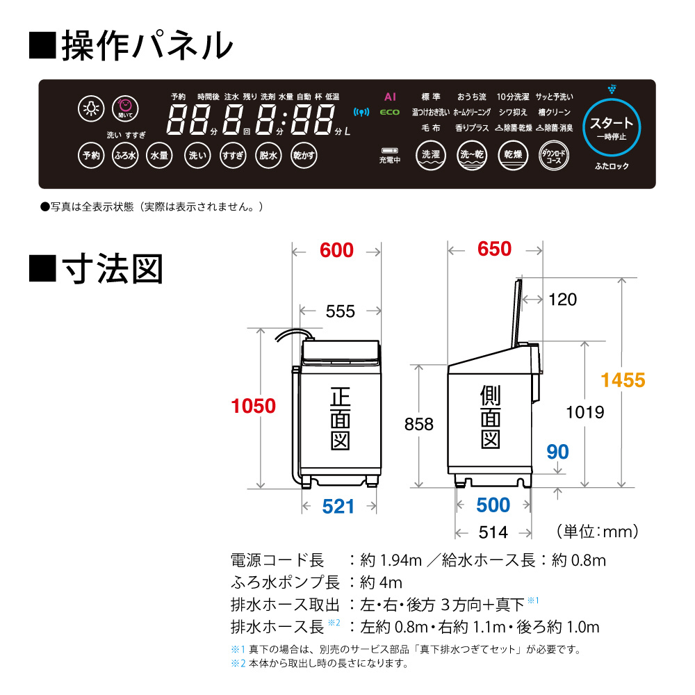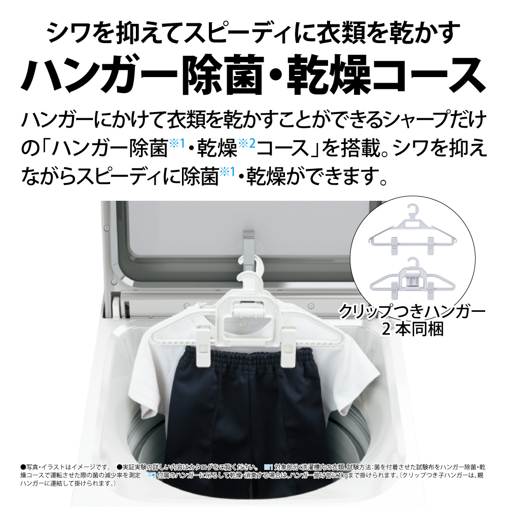 | コース | 標準、おうち流、10分洗濯、サッと予洗い、温つけおき洗い、ホームクリーニング、シワ抑え、槽クリーン、毛布、ハンガー除菌・消臭、ハンガー除菌・乾燥 |