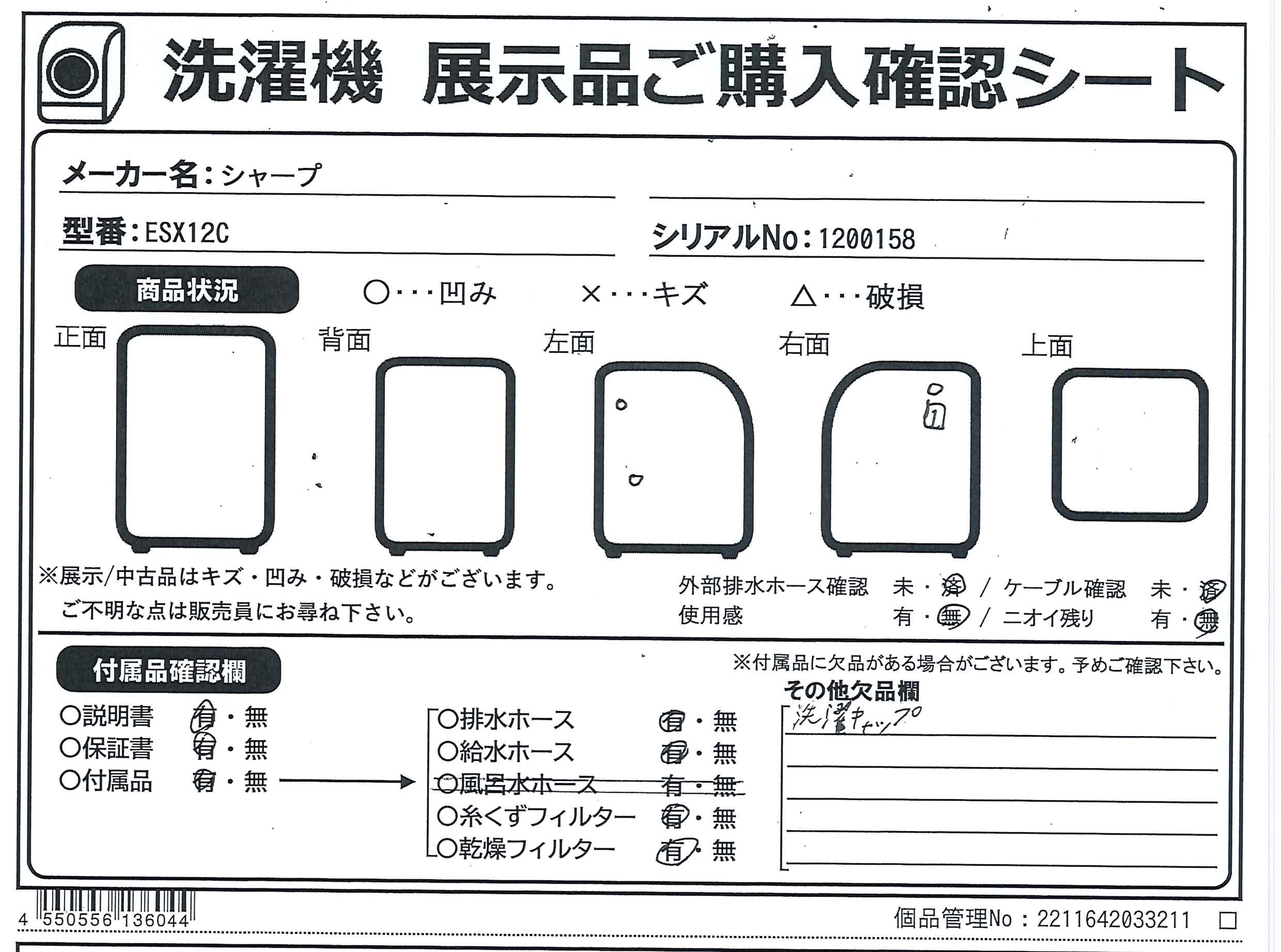中古商品ランクについて 付属品・商品状態について 〔付属品〕取扱説明書、シャープクラウドサービスガイド、洗剤ご使用ガイド、給水ホース、水栓つぎて、外部ホース、ホースクリップ、水準器、輸送用固定ねじ(上用×2・下用×2)、ビスシート(2枚入り×2)、据付チラシ
